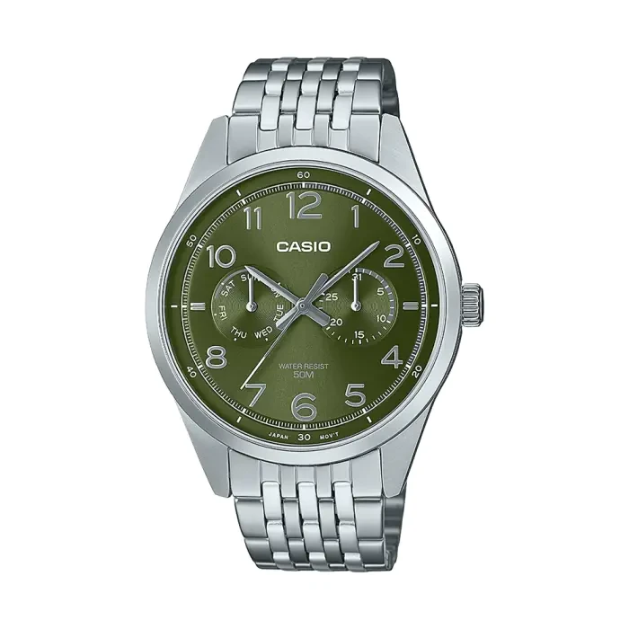 The watch includes 2 sub-dials for date and day, adding functionality to its classic design. It offers 50-meter water resistance and is protected by mineral glass for durability against scratches.