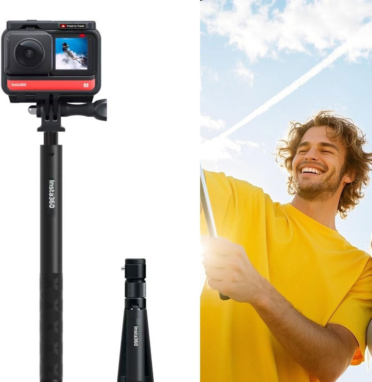 This multi-functional selfie stick features a built-in foldable tripod, allowing you to easily switch between handheld shooting and stable tripod recording. Its invisible selfie stick technology ensures the stick disappears in 360° footage, giving you clean, drone-style shots without obstruction.