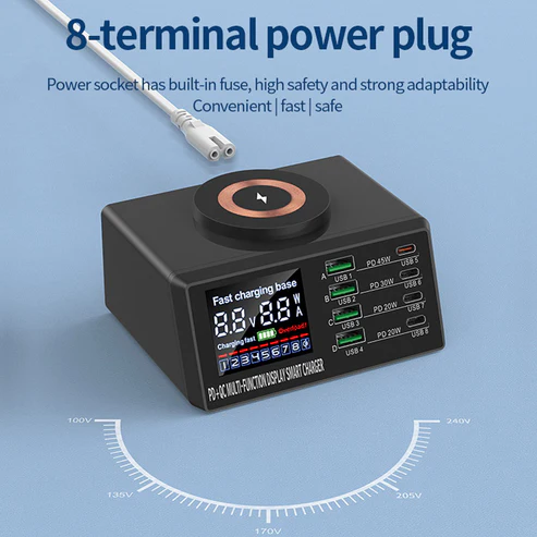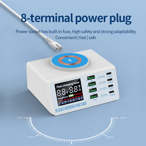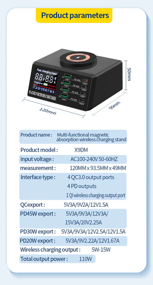 The CRONY WLX-X9M Multi-Functional Charger Station is a high-capacity charging hub designed to power multiple devices simultaneously. With a maximum output of 110W across 8 ports, including 4 USB-A and 4 USB-C, it supports fast charging for smartphones, laptops, gaming devices, and more. Its multifunctional design combines wired USB charging with wireless magnetic fast charging for compatible devices.