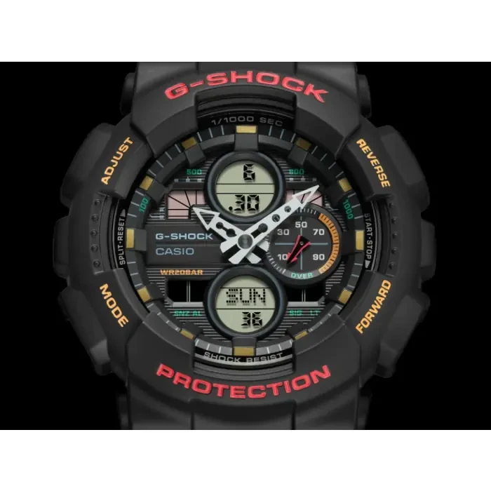 Designed for tough environments, this analog-digital sports watch features a durable resin case and band with magnetic resistance and shock resistant construction. Mineral glass adds extra protection against scratches and impacts, making it ideal for active lifestyles.