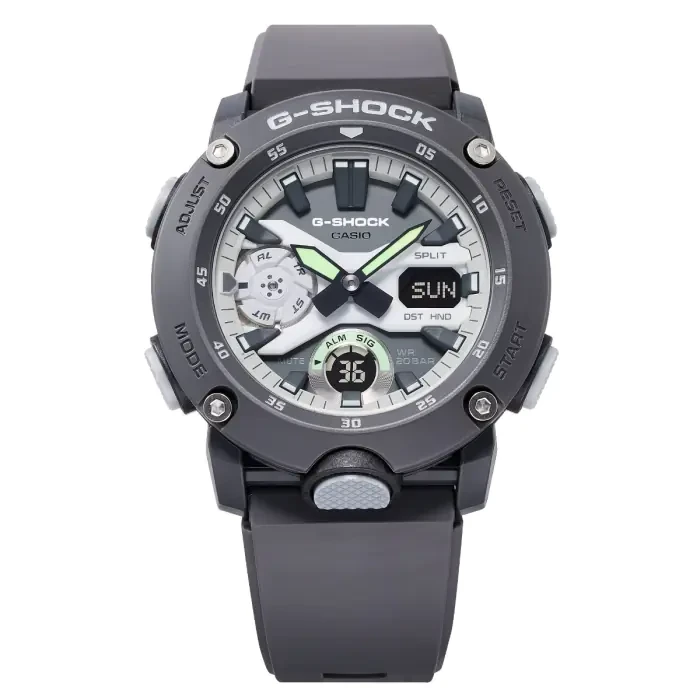 This carbon and resin analog digital sports watch is designed for durability, performance, and modern functionality. Built with a Carbon Core Guard structure and shock-resistant construction, it delivers reliable strength for outdoor activities, sports, and everyday use. With 200-meter water resistance and mineral glass protection, it is ready for challenging environments.