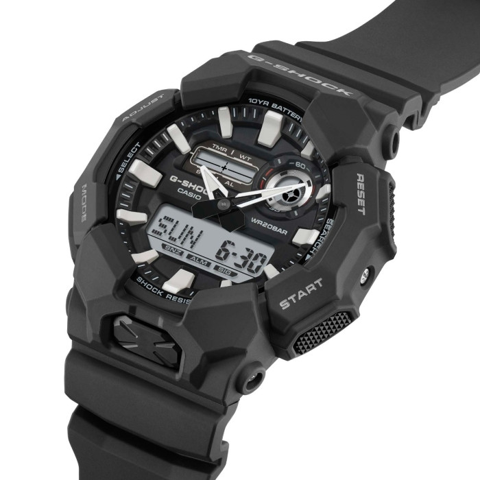 The Super Illuminator LED light ensures visibility in low-light conditions, while the hand shift feature keeps the digital display unobstructed. With a long-lasting 10-year battery, full auto-calendar to 2099, and reliable ±15 seconds per month accuracy, this G-Shock offers dependable performance in a tough, stylish design built for active lifestyles.