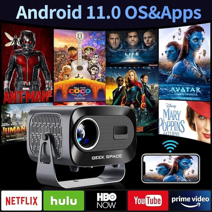 Transform your home entertainment with this Android 11.0 Portable Projector, designed to deliver bright, sharp, and immersive visuals anywhere. With an impressive 12000 lumens brightness and Full HD 1080P resolution, it produces vivid images and clear details even in well-lit rooms. Built-in Android 11.0 allows direct access to streaming apps without external devices, while WiFi 6 and Bluetooth 5.2 ensure fast, stable connectivity. The 360° adjustable angle offers flexible setup for movies, presentations, and gaming at home or on the go.