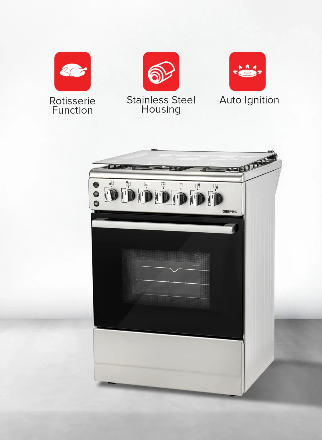 The Geepas GCR6059 Free Standing Cooking Range brings together power, efficiency, and a sleek look to help you cook better. It has a strong stainless steel body and measures 60x60cm, making it a great fit for modern kitchens. This range includes four gas burners that provide even heat, helping you cook with accuracy, and a built-in oven with bake, grill, and rotisserie settings for a variety of meal options. The auto ignition system makes it easy and safe to light the burners with just a simple turn of the knob. Whether you're cooking, baking, or grilling, this appliance offers both strong performance and long-lasting reliability.