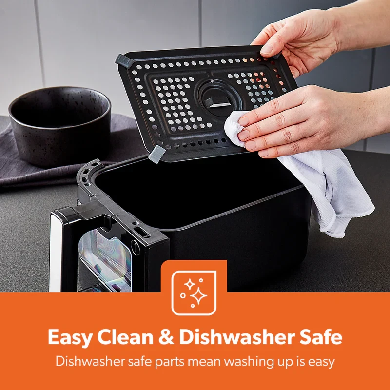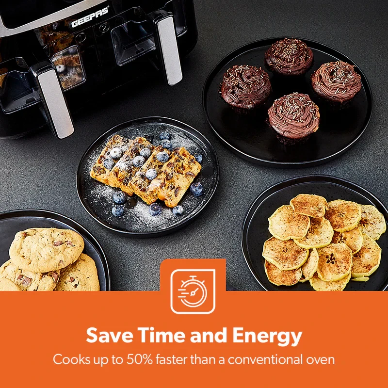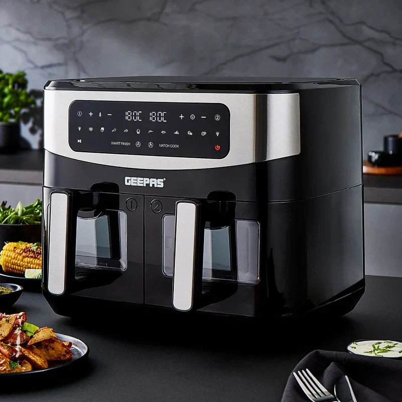 Cook more efficiently and healthily with the Geepas 9L Dual Basket Digital Air Fryer GAF37525UK, which uses advanced Vortex Air Frying Technology to deliver evenly cooked, crisp results with very little oil. The dual 4.5L baskets let you prepare two different dishes at the same time, making it ideal for families or when entertaining guests. The LED digital display paired with a responsive touch screen makes it easy to choose from 10 preset cooking settings for fries, chicken, fish, steak, and more. You can adjust the temperature and time settings for precise control, and the air fryer’s modern, durable design fits well in any kitchen.