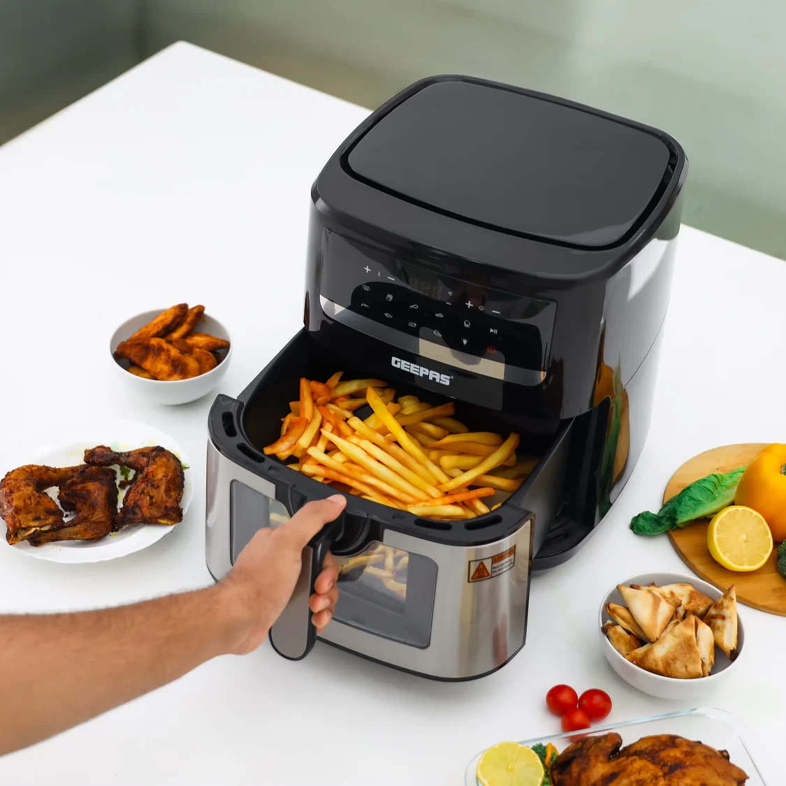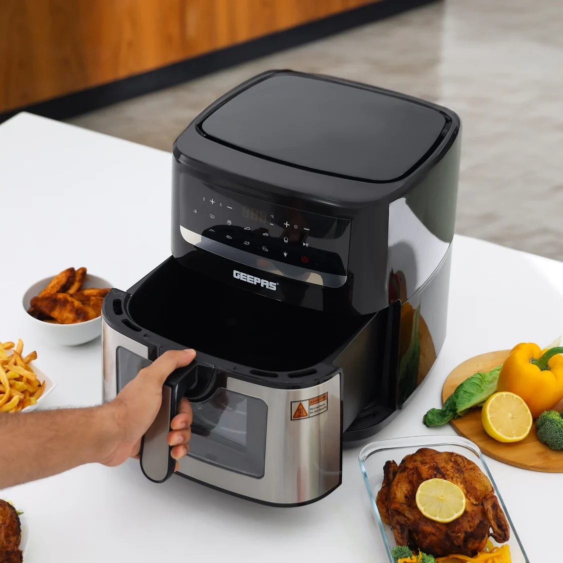 Cook faster and healthier with the Geepas Double Heating Digital Air Fryer GAF37544. It uses advanced Vortex Frying Technology and a dual heating system to cook food evenly and efficiently. The large 9.2-liter capacity is great for families, letting you cook several dishes at once. The digital touch display with 9 preset programs makes it easy to cook a variety of foods like fries, chicken, fish, pizza, and more. You can adjust the temperature from 50°C to 200°C and set a timer from 1 to 60 minutes for precise cooking. This air fryer offers excellent performance, versatility, and energy efficiency in one sleek appliance.