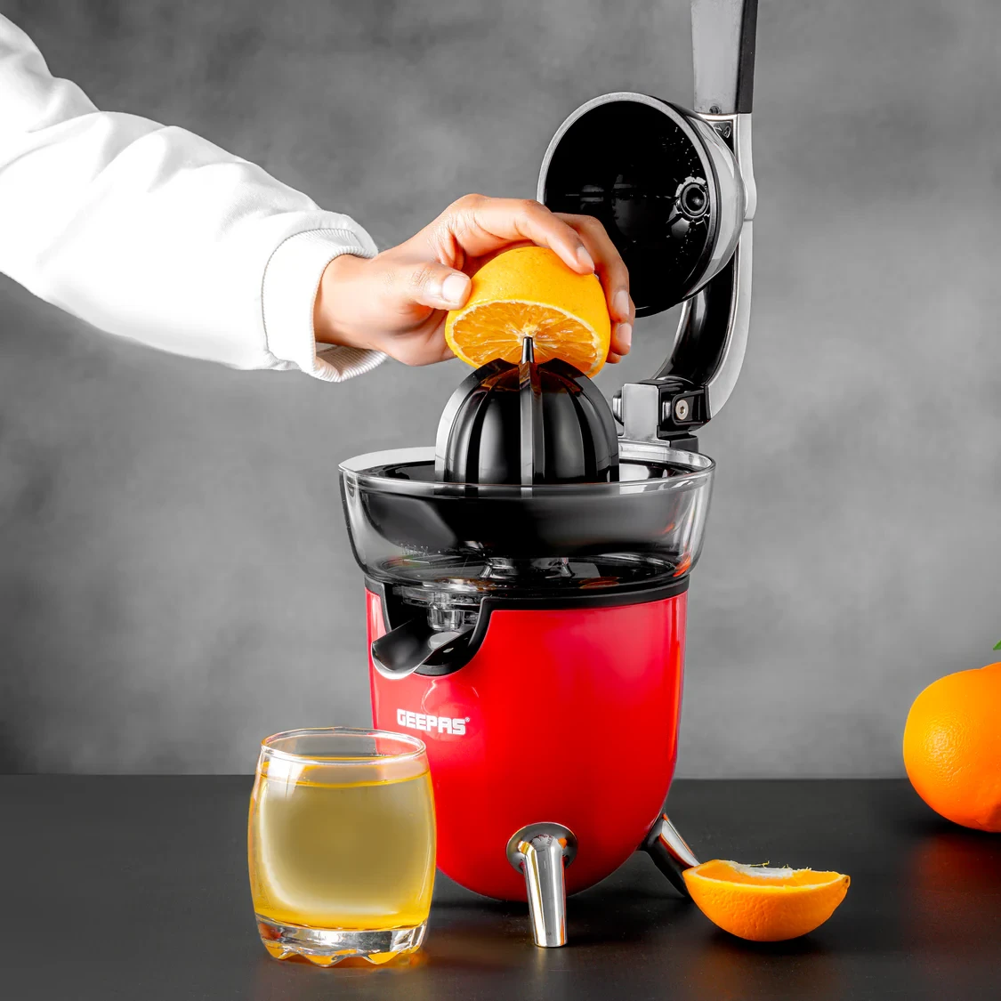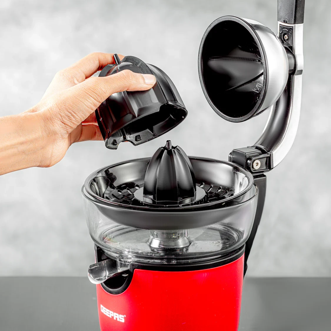 The Geepas GCJ46021 Stainless Steel Citrus Juicer is made to make juicing your favorite citrus fruits easy and efficient. It has a strong stainless steel body that makes it last a long time and looks modern. The juicer comes with two different cones that fit both small and large fruits, so you can use it for oranges, lemons, limes, and grapefruits. There's a built-in filter basket that separates the pulp and seeds, so you get smooth and tasty juice every time. The transparent juice collector lets you see how much juice you're getting, and the easy-to-clean design helps you keep it clean quickly and safely.