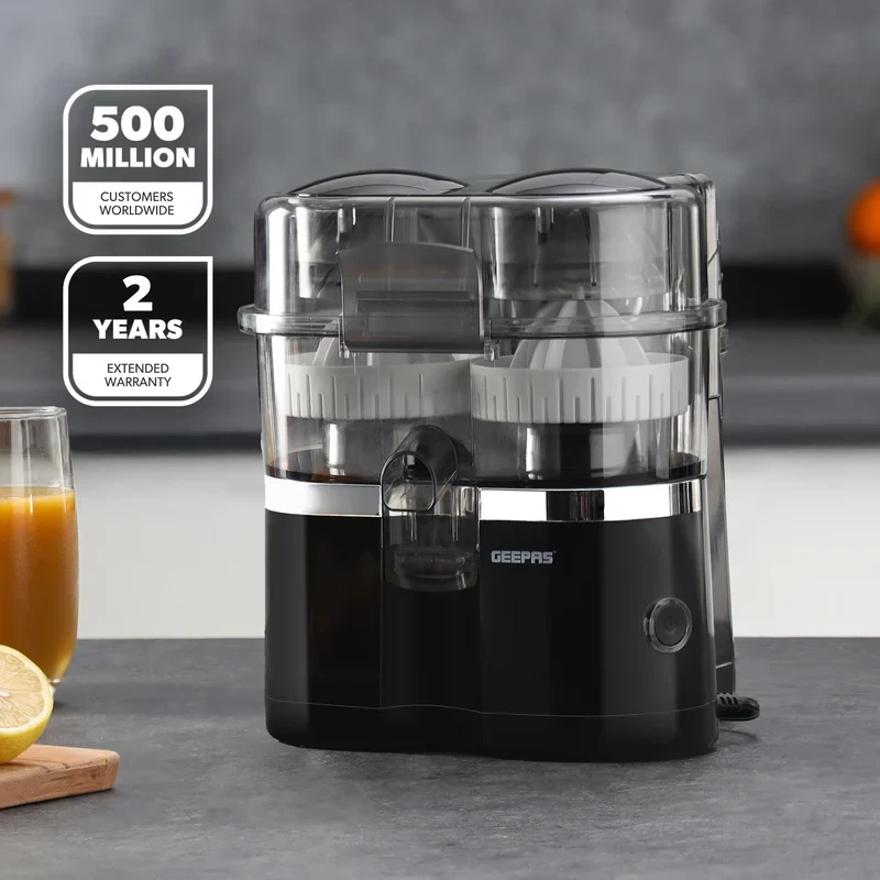 The Geepas GCJ5347 Dual Head Citrus Juicer is a clever and effective way to make fresh juice quickly and easily. Its dual head design lets you juice two pieces of fruit at the same time, making the process twice as fast. The juicer also comes with a built-in slicer that helps you prepare the fruit before juicing, which saves you time and effort. The 100W motor ensures that the juicer works smoothly and consistently, giving you good results every time. There's also a strength control feature that lets you adjust the pressure to get the most juice out of your fruit. And with the one-press operation, using the juicer is simple and straightforward. It's great for juicing oranges, lemons, and limes, and it delivers fresh, healthy juice in no time at all.