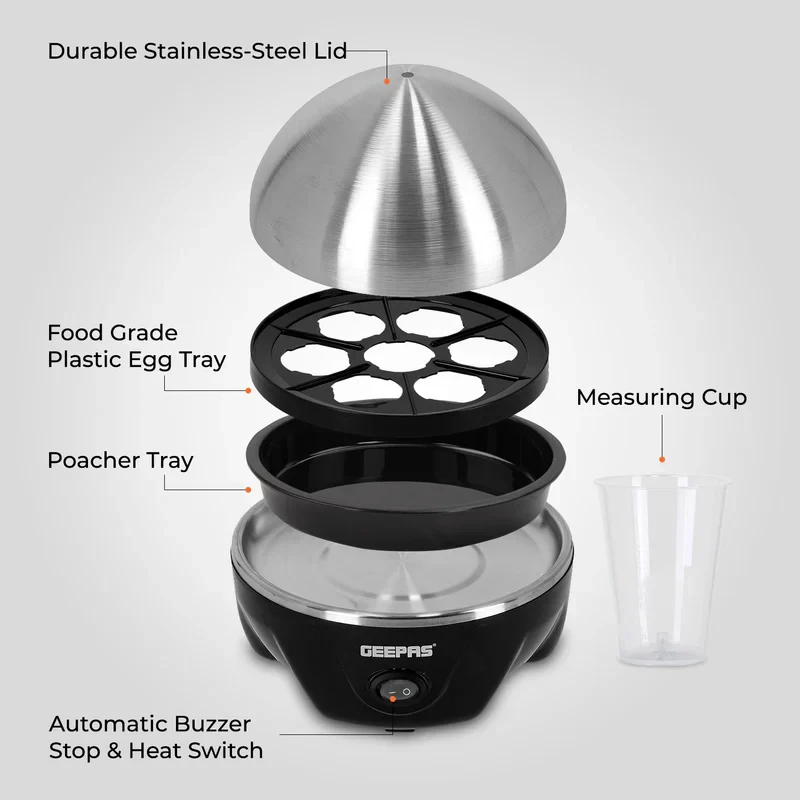 Enjoy perfectly cooked eggs every morning with the Geepas GEB63032UK Egg Boiler. This efficient and convenient egg cooker is designed to make your mornings easier. It can cook up to 7 eggs at once, making it perfect for families or when you're in a rush. With a 350W heating element, it cooks your eggs quickly and evenly. When your eggs are done, an automatic buzzer lets you know, and the stainless steel cover makes it strong and looks stylish. Whether you like your eggs soft, medium, or hard-boiled, this egg boiler gives you great results with very little effort.