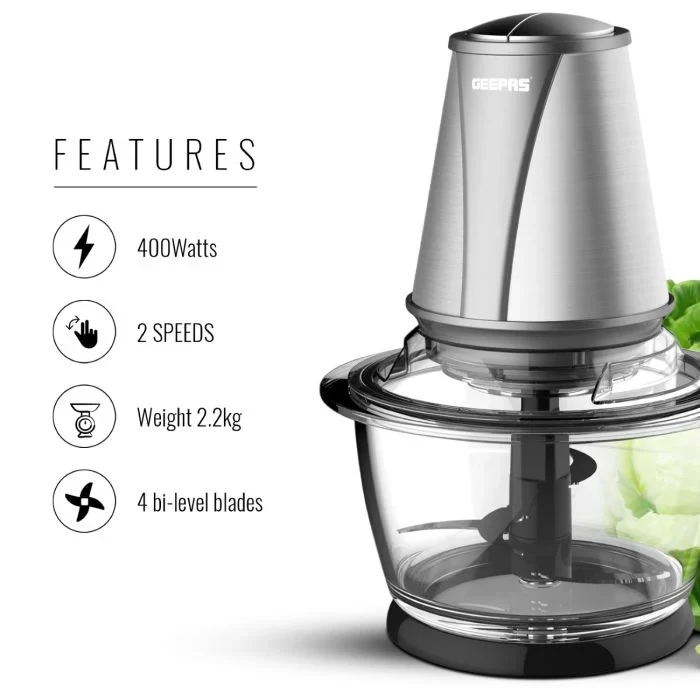 The Geepas GMC42014 Multi Chopper is a strong and small kitchen tool that makes cooking easier. It has a 400W motor and two speed settings, letting you chop, blend, and mince different foods with control. The 1.2L glass bowl is sturdy and keeps your food clean, while also letting you see what's inside. The stainless steel blades work quickly and evenly to give you great results. This chopper is great for vegetables, fruits, nuts, and even meat. It's powerful and practical, and fits well in any kitchen because of its small size.