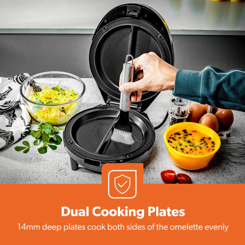 The Geepas GOM36535UK Omelette Maker is made to help you make light, fluffy, and cooked-through omelettes every time. It has a strong 1000W heating system and a non-stick 185mm cooking plate, so you can cook tasty omelettes, pancakes, or filled egg dishes quickly without them sticking or burning. The automatic temperature control helps keep the cooking even, and the green and red lights make it easy to know when it's ready. The anti-slip feet keep the maker steady while you use it, and the small size makes it simple to store — making it a great addition to any kitchen.