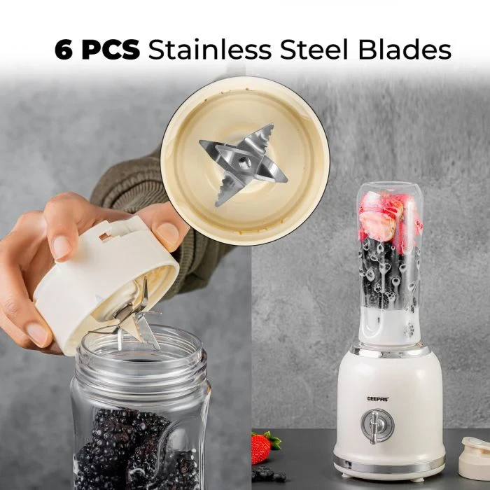 The Geepas GSB44113 Personal Blender is a small and handy tool that makes it easy to blend on the go. It has a 300W motor that works well to mix fruits, veggies, and ice into smoothies, shakes, and juices. The blender comes with two 600ML bottles made from BPA-free Tritan, which are clear, tough, and safe for everyday use. The blades are made of stainless steel, making sure your blends are smooth and consistent. The one-touch button makes it simple to use, which is great for a busy life. This blender is perfect for people who work out often or travel, offering a mix of good performance, safety, and portability.
