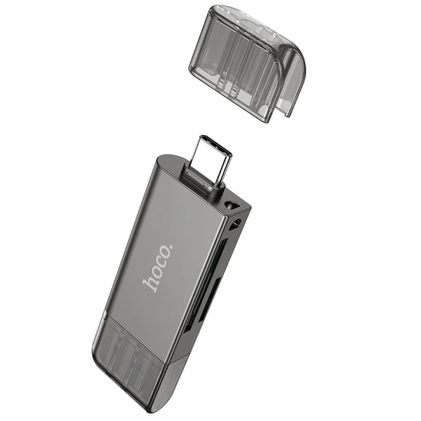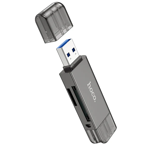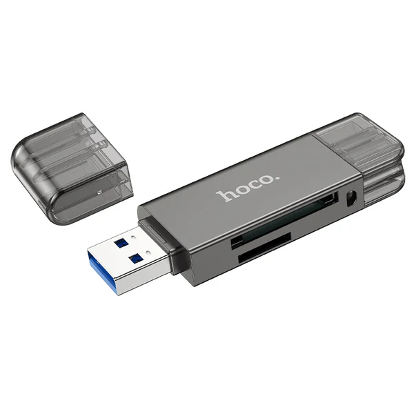 The Hoco HB39 USB Type C 3.0 High Speed Card Reader is designed for efficient data transfer and convenient access to memory cards. It is built using zinc alloy and PC, offering a compact and durable structure that measures 69.5 × 22 × 9 mm and weighs 23 g. The dual interface supports USB and Type C 3.0 connections, making it suitable for a wide range of laptops, tablets and other compatible devices.