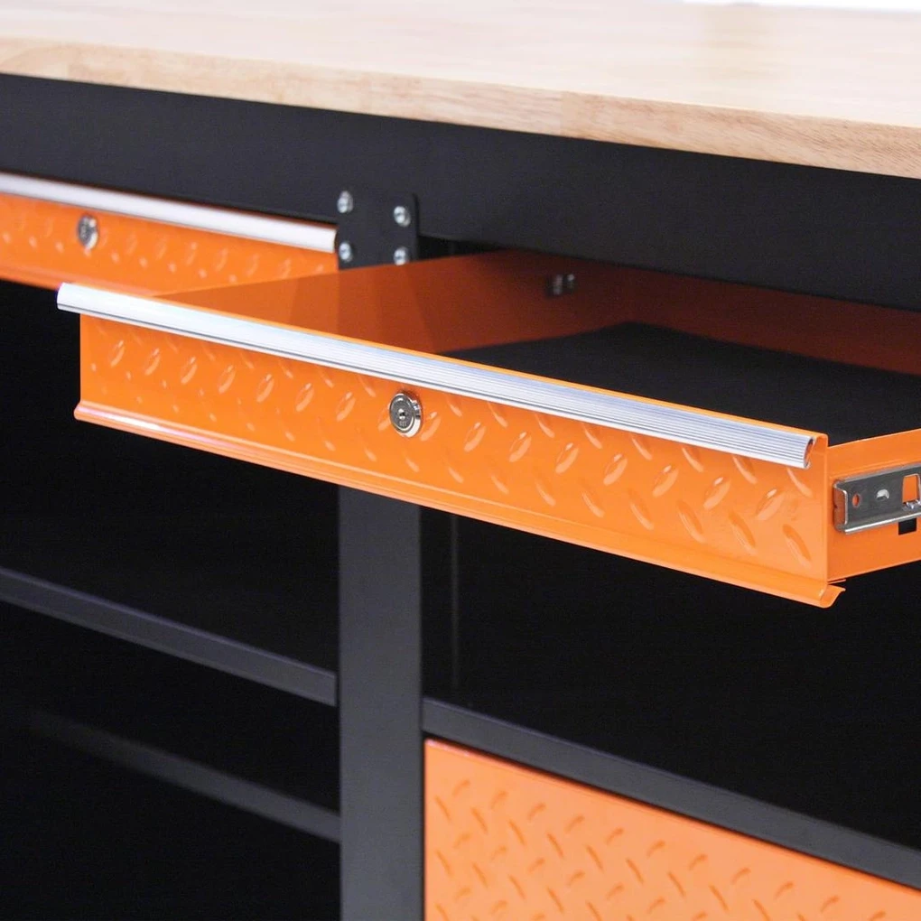 The bench includes multiple storage options — two small drawers (6 kg each), a single shelf (5 kg), and four spacious shelves (10 kg each) — allowing you to neatly organize your tools and accessories. The double ball bearing slides ensure smooth drawer operation, while the lockable drawers and cabinet keep your valuable tools safe and secure.