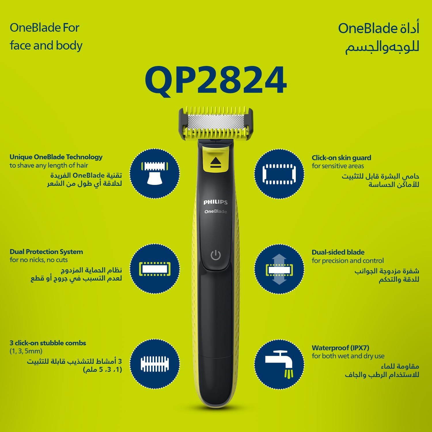 Experience the next generation of grooming with the Philips OneBlade QP2824/10, a revolutionary hybrid trimmer and shaver designed for your face and body. The OneBlade trims, edges, and shaves any length of hair with ease — giving you a precise, comfortable grooming experience without the irritation of traditional blades.