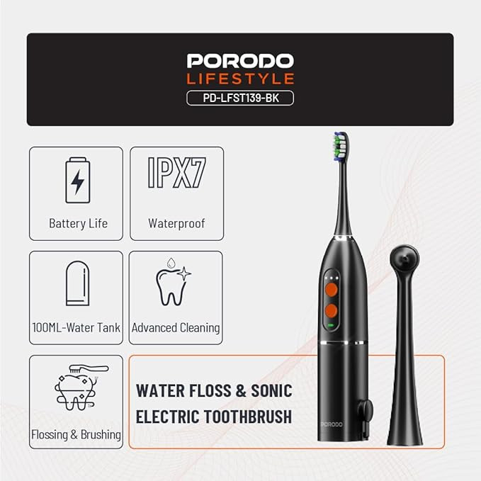 Upgrade your oral care routine with the Porodo Lifestyle Electric Toothbrush with Water Flosser. This all-in-one device combines a sonic toothbrush and water flosser for deep cleaning, healthier gums, and a brighter smile. Designed with IPX7 waterproof technology and a 100ml water tank, it’s perfect for home or travel use. The toothbrush comes with 2 replacement brush heads, 25-day long-lasting battery life, and multiple cleaning modes to suit your needs. Compact, efficient, and travel-friendly, the Porodo electric toothbrush ensures professional-level oral care anytime, anywhere.