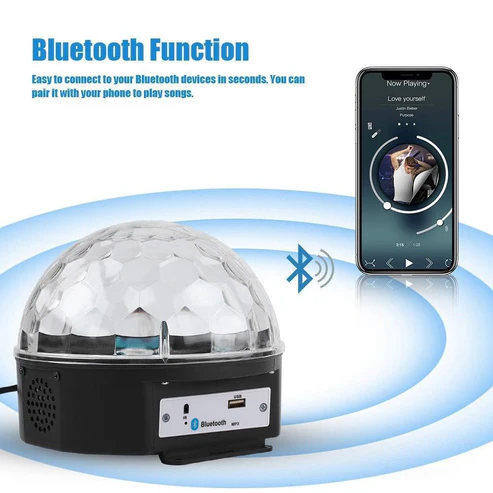 C magic ball with BT music Party Light With Bluetooth Crystal Disco Ball Multicolour Product Description 1) MP3 music magic ball.Exquisite crystal ball appearance transparent lampshade with good light-admitting quality. Supports SD cards USB disks and other devices via a USB cable such as MP3 MP4 player etc. (This item is supplied with a USB disk.) 2) With a remote control. You can easily use it to select songs adjust music volume etc. 3) It can change its flicker frequency along with the rhythm of music. 4) High brightness and comfortable lighting effects.Suitable for KTV dance room bar stage club home decoration party etc. 5) Fast delivery and 100% full inspection before send to you Specifications: Color: Black Material: ABS Plug specification: European /US according your country Voltage: AC110V/220V 50/60Hz Power: 6W DMX channels:6 channels RGB Power: 12W Audio power: 5W Supported configuration: A2Dp Wireless range: (33ft) Places of Use: Suitable for family gatherings Party KTV box Disco dance hall nightclub bar shopping mall hotel karaoke Plaza park and other places to use Product Size: 17cm 15cm(approximately) Package: 1 pcs LED Stage Light