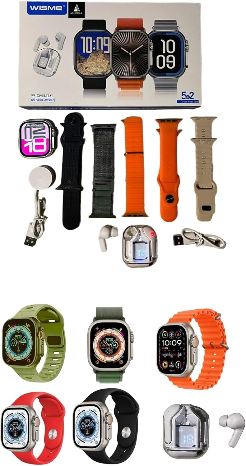 The ADHOMAX Wisme WS-X19 Ultra3 Smartwatch + Earbuds is a premium 2-in-1 wearable designed for both men and women. Featuring a sleek silver finish it includes a high-resolution display built-in GPS and advanced AI GPT assistance for smart hands-free control. The package comes with 5 smartwatch straps and 2 earbuds giving you flexibility in both style and function. Stay connected with Bluetooth calling notifications and voice commands while tracking your health with BPM monitoring fitness tracking sleep analysis and multiple sports modes. Enjoy added convenience with music and camera control weather updates alarms and wireless charging for hassle-free power. Compatible with both iOS and Android the WS-X19 ensures seamless connectivity and performance. Backed by a 3-month warranty it’s a complete smartwatch and audio solution in one package. Includes smartwatch + 2 wireless earbudsComes with 5 interchangeable strapsGPS AI GPT voice assistantBluetooth calls smart notifications alarmsFitness tracking BPM sleep monitorMusic camera control + weather updatesWireless charging with long-lasting batteryStylish silver design for men womenCompatible with iOS Android