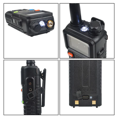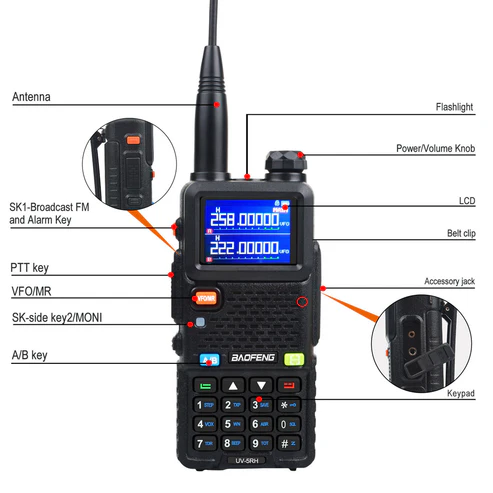 Model : UV-5RH Frequency Range : UHF (400-480MHz) VHF (136-174MHz) 220-260MHz Communication Range : 5-10 KM Voltage : 7.4V Channel Capacity : 999 Antenna Type : External Product Size : 135x63x41MM Output Power : 10W Audio Power : 1W Battery Capacity : 3500mAh Weight : 275GM: Additional Features : FM Function Large LCD Screen LED Flashlight Built-in Stopwatch USB Type-C Charging Note: All Specifications may be modified without prior notice or liability.  Thank you! Notes: The UV-5RH series products are divided into M Version and L version. M version supports AM 108-136Police 350-390MHz scanning reception and voice scrambling function. The L version doesn’t not support those frequencies. And here we are selling is UV-5RH L Version. Package Contains: 1× UV-5RH Radio Body 1× 7.4V 2500mah Li-ion Battery Pack 1× SMA-Female Dual Band Antenna 1× Desktop Charger with Correct Adapter for your Country 1× Belt Clip 1× Plastic Snap-fit attachment for Charger 1× Handstrap 1× ENG Manual