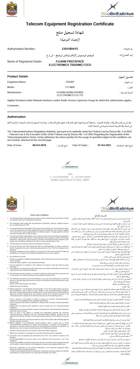 Model : CY-8800 Frequency Range : UHF (400-470MHz) Communication Range: 8-15 KM Voltage : 7.4V Channel Capacity : 128 Antenna Type : External Product Size : 113x64x41MM Output Power : 10W Audio Power : 1W Battery Capacity : 3500mAh Weight : 262GM Additional Features : LCD Display LED Flashlight Headsets included Two Antennas in Box