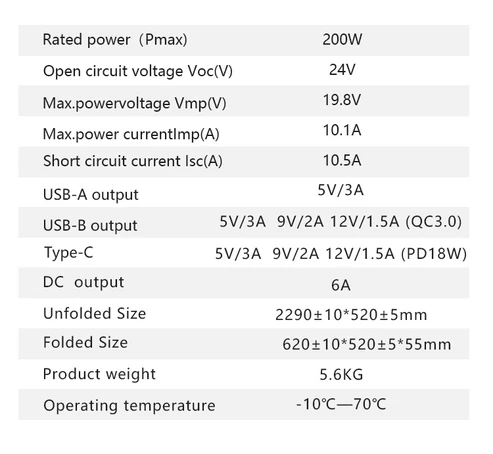 CRONY 200W Portable Solar Panels foldable solar panel for camping Rated power (Pmax): 200W Open circuit voltage Voc(V): 24V Max.powervoltage Vmp(V): 19.8V Max.power currentlmp(A): 10.1A Short circuit current lsc(A): 10.5A USB-A output: 5V/3A USB-B output: 5V/3A 9V/2A 12V/1.5A(QC3.0) Type-C: 5V/3A 9V/2A12V/1.5A(PD18W) DC output: 6A Unfolded Size: 2290 520mm Folded Size: 620520mm Product weight: 5.6KG Operating temperature: -10℃ - 70℃