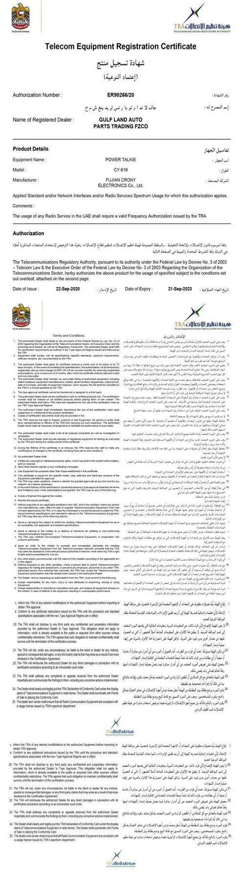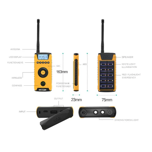 Model : CY-919 Frequency Range : UHF (400-470MHz) VHF (136-174MHz) Communication Range : 1-4 KM Voltage : 3.6V Channel Capacity : 22 Antenna Type : External Product Size : 163x75x23MM Output Power : 5W Audio Power : 1W Battery Capacity : 15000mAh Weight : 320GM Additional Features : Built-in Compass LCD Display Solar charging LED Flashlight Dual USB Outpust Wireless Charging