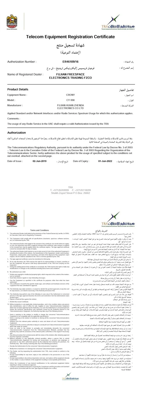 Model : CY-998 Frequency Range : UHF (400-480MHz) Communication Range: 1-4 KM Voltage : 3.7V Channel Capacity : 22 Antenna Type : Integrated Product Size : 135x52x18.7MM Output Power : 5W Audio Power : 1W Battery Capacity : 1500mAh Weight : 97.8GM Additional Features : LCD Display Earphone Jack Ultra Thing Design Micro USB Charging