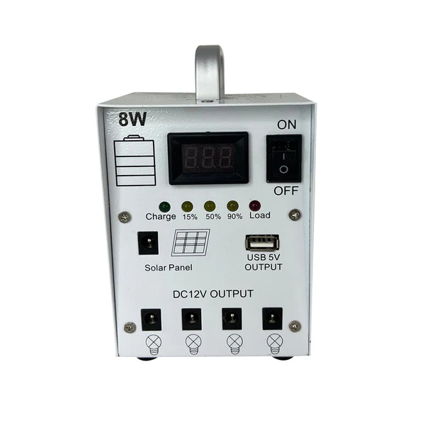 Components 1. Mono solar panel: 8W/18V 2. lead acid battery 12V 4.5A 3.Solar controller 12V 3A 4.Led lamp 12V 2W(2pcs) 5.Ligting cable 5m 6.Solar panel cable 5m 7. 3in1 usb cable kits 8.12V DC ports 4pcs (for bulbs) 9.USB port 5V 2.5A 1pcs 10.Working time for 24 hours for lighting 11.solar charging time 8 hours by solar Application For solar power system: 1.Charging time: generally is about 7 hours full charged 2.Work time:17-20 hours for 2w led light after fully charged 3.Have wide use for indoor and outdoorsuch as homehousecampingtourismclimbing and some emergency etc. 4.USB port : 5V 2.5A continous working current at 2.1A 5. Peak power 21.06v for solar panel short circuit protetion current 0.74A Use for lighting and mobile or other 5V appliances charging. Advantages: 1.No electricity required 2.Powered by sunlight during daytime 3.Lighting up at dark automatically 4.Easy to install without wiring needed 5.Anywhere to installTwo ways to install on ground on wall 6.LED screen display of battery status when battery voltage is over than 12.5v it means battery full charged. 7.Lead acid battery used in power box. 8.Safe and long life.