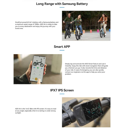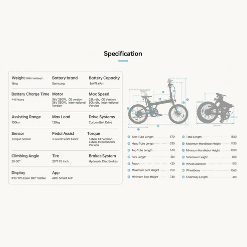 Model : A20 Motor : 350W Speed : 25-30KM/H Battery : 36V/10.4AH Range : 80-100KM Charging Time : 4-6H Brake(Front/Rear): Disc/Disc Max Loading Weight : 120KG Frame Material : Aluminum alloy Carton Size : 88x36x62CM G.W./N.W : 20KG/18KG Additional Features : Foldable 3 Level Pedal Asist LED Display App Connectivity