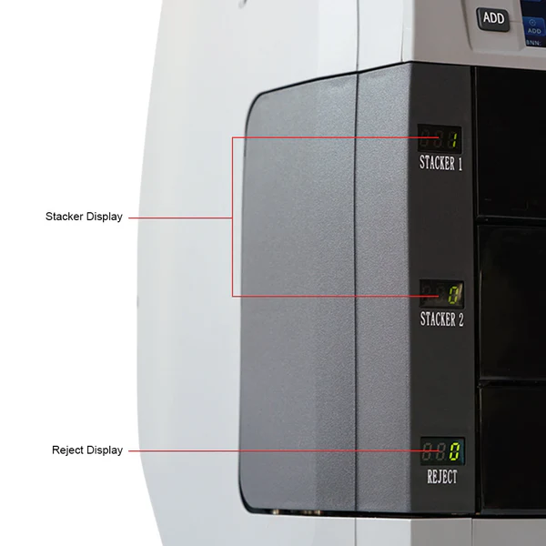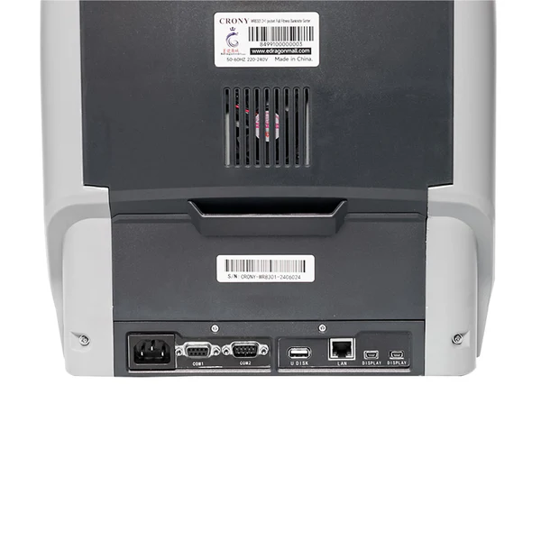 Specifications : Model : WR8301 Counting Speed : 800/1000/1200 pcs/min Hopper Capacity : ≥1000pcs Stacker Capacity : 200pcs2 Reject Capacity : 100pcs Detection Technology : Dual CIS IR UV MG MT ThicknessSerial Number RecognitionRGB Image Recognition Power Supply : AC 110-220V Power Consumption : ≤150W Interface : USB RJ-11 RS232 LAN Product Size : 314x348x460MM Weight : 22.6KG Additional Features :  8 Types Sorting Modes Built-in 5 Touch Display External Display Support External Printer Support Dual Stacker Array