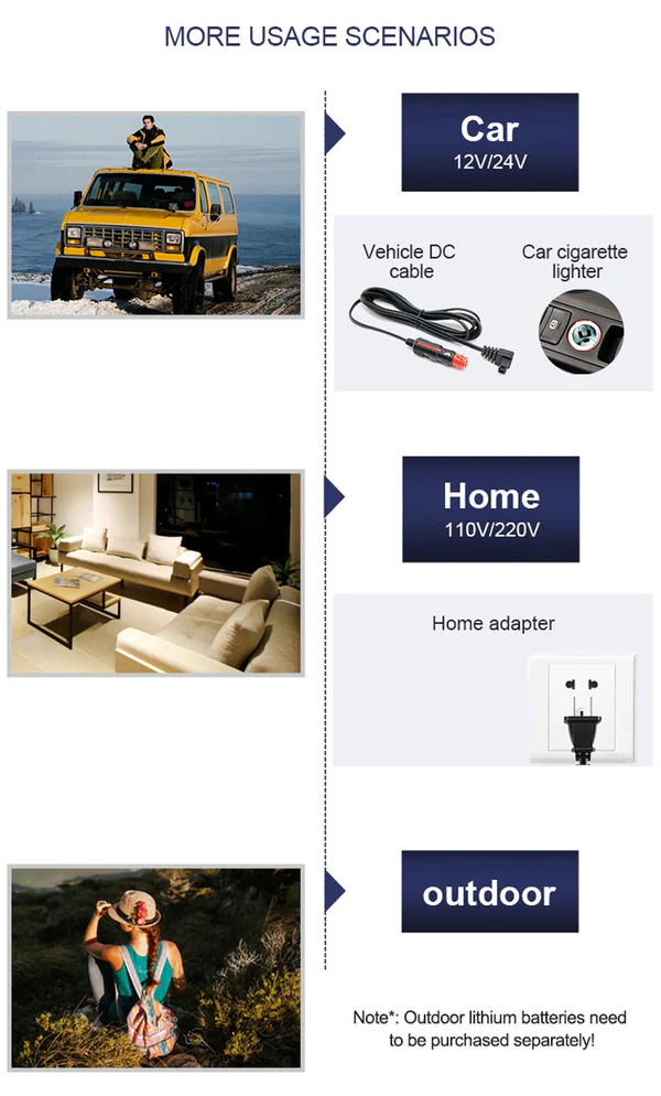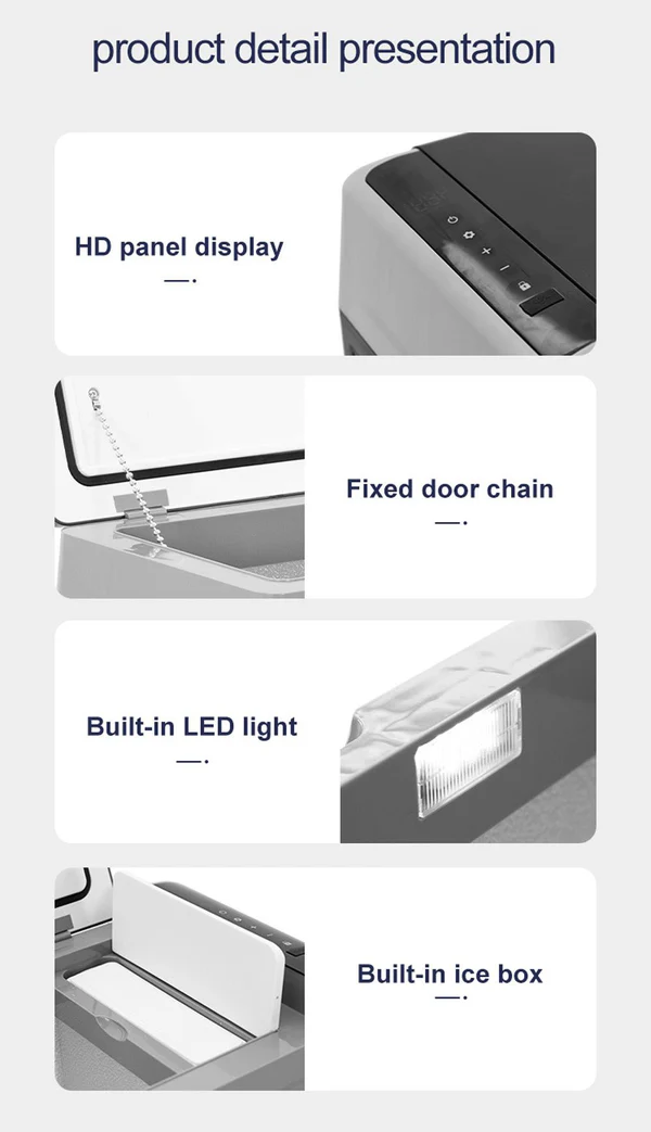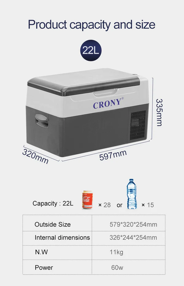 CRONY 22L Custom fridge small car fridge freezers refrigerator outdoor  12v compressor fridge Model :   22L Car Refrigerator Rated Voltage :   DC 12V/24V; AC 100~240V Power Consumption : 60W Power Source :  AC/DC Capacity :    20.7L Noise Level :    <45dB Temperature Range : -20C to 20C Product Size :  59.8x32x33.5CM Net Weight :   11KG Gross Weight :  12KG Additional Features : LED Control Panel Built-in Ice Box USB Power Outlet Fixed Door chain Car Battery Protection