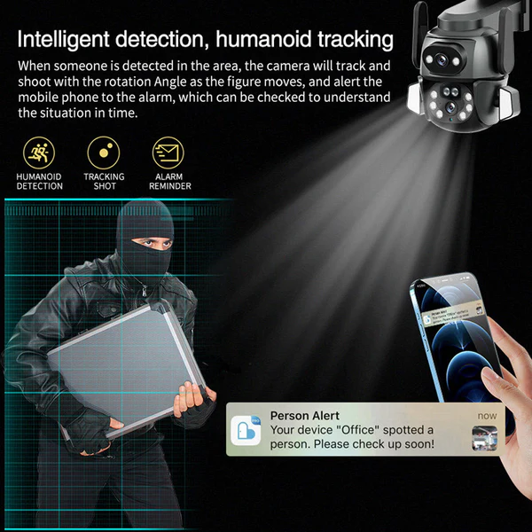 CRONY CG-Q821A WIFI-4MP(carecamPro APP)Dual gun-ball linkage Camer Model : CG-Q821A Megapixels : 4MP Connectivity : Ethernet/Wi-Fi Power Source : DC 12V Storage : TF Card/Cloud Resolution : 2K Audio : SpeakerMic PTZ Function : 355 Horizontal 90 Vertical Battery Capacity : NIL Product Size : 200x180x160MM Gross Weight : 885g Additional Features : IR Night Vision Motion Detection Humanoid Tracking Dual Camera View Support Two-way audio App Connectivity