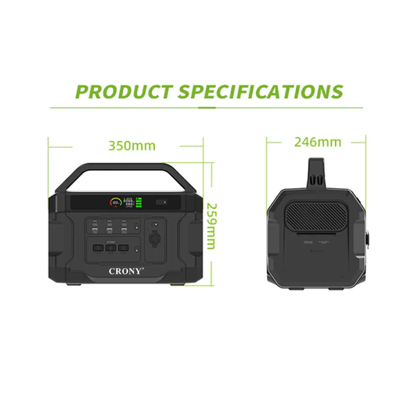 CRONY CN1002-1800W Portable Power Station Model : CN1002 Output Power : 1800W Input Specification : DC 11-50V/8.5A AC 230V~50Hz 800W Max Battery Capacity: 896Wh Output Types: 1x 12V DC Cigarette plug 1x USB C port (PD-100W) 1x USB A 5V 3A 2x USB C port (PD-30W) 2x USB A 5V 2.4A 2x 12V DC ports 2x AC 230V outlet Charging Time : 1.4H Dimension : 351x253x260MM G.W/N.W : 13.03KG/11.08KG Additional Features : LED Light Built-in LCD Screen Over-charge protection Overheating protection Support Fast charging