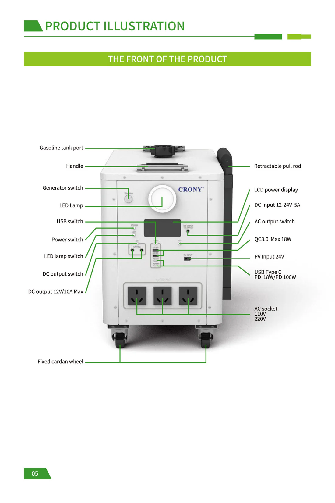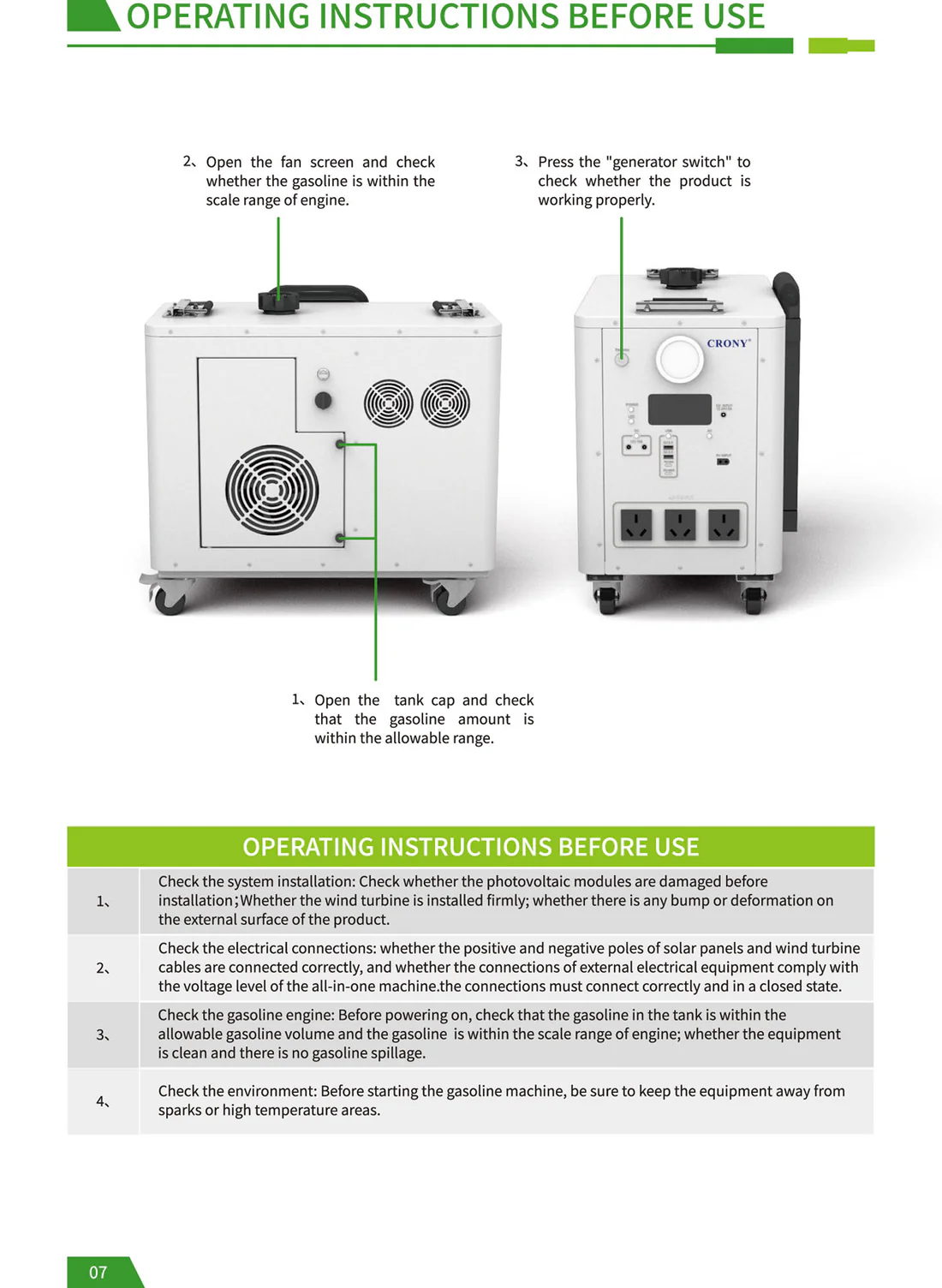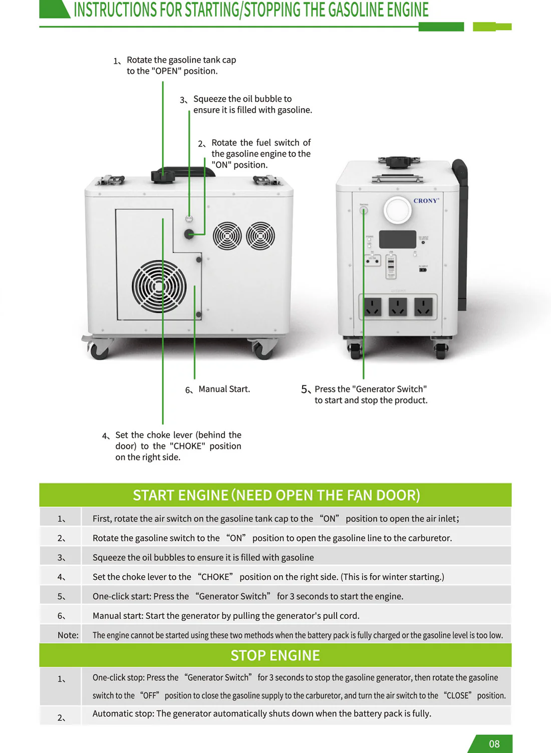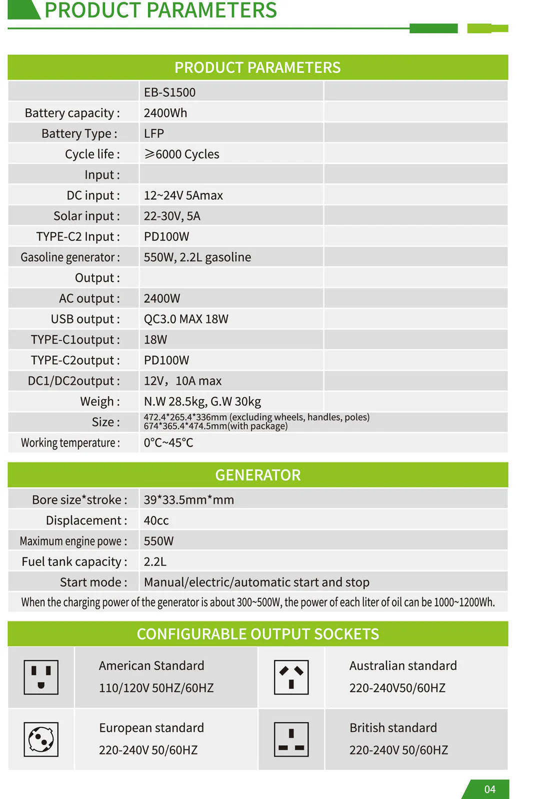 CRONY EB-S1500 2400W Gasoline storage battery With Trolley LiFePO4 Battery 550W Engine with AC DC USB Output for Home and Outdoor Use The biggest selling point of the product: it is the hybrid energy storage mode! Just like a hybrid electric car when the energy storage battery is exhausted add gasoline directly to the gasoline port and the gasoline engine can quickly charge the battery solving the limitations of slow outdoor charging and reliance on solar energy. For example when there is no sun at night and you can't find a charging device adding a barrel of oil can make the battery full of blood which is especially suitable for outdoor operations camping and other scenes that require continuous power supply. Pay special attention before use: When you receive the product you need to add engine oil and then gasoline before you can use the gasoline generator to generate electricity. The product has 70-80% electricity when it leaves the factory and customers can use it directly after receiving the product. Add 150-180ml of engine oil at a time not more than 200ml and add it once every 1-2 months. Just change it once Engine oil plays a lubricating role. Changing the engine oil is mainly to protect the service life of the generator for a longer period of time which is similar to the principle of our car Model : EB-S1500 Battery Capacity : 2400Wh Rated Power : 2400W Battery Type : LiFePo4 Battery Battery Lifecycle : ≥4000 times Solar Input : Solar Panel 400W Max Engine Bore and Stroke : 3933.5mm Engine Displacement : 40cc Maximum Engine Power : 550W Fuel Tank Capacity : 2.2L Start Method : Manual Electric Auto start stop PV Input : XT60 24V DC Input : 24V AC Output : AC Outlet 600W 110V 220V 3 DC Output : 5521 DC 12V 10A Max 2 USB Type-C Output : PD QC3.0 MAX 30W PD100W USB Output : QC3.0 MAX 18W 2 LCD Display : Power percentage and Power bar display Net Weight : 28.5 kg Gross Weight : 30 kg Product Size (mm) : 472 X 4265 X 4336 mm (not including wheels handle bars) Package Dimensions : 555 X 350 X 500 mm
