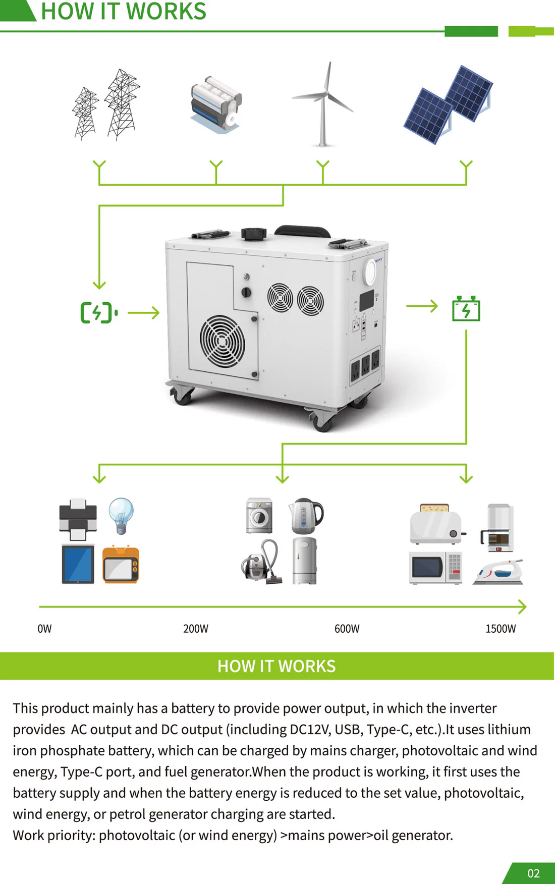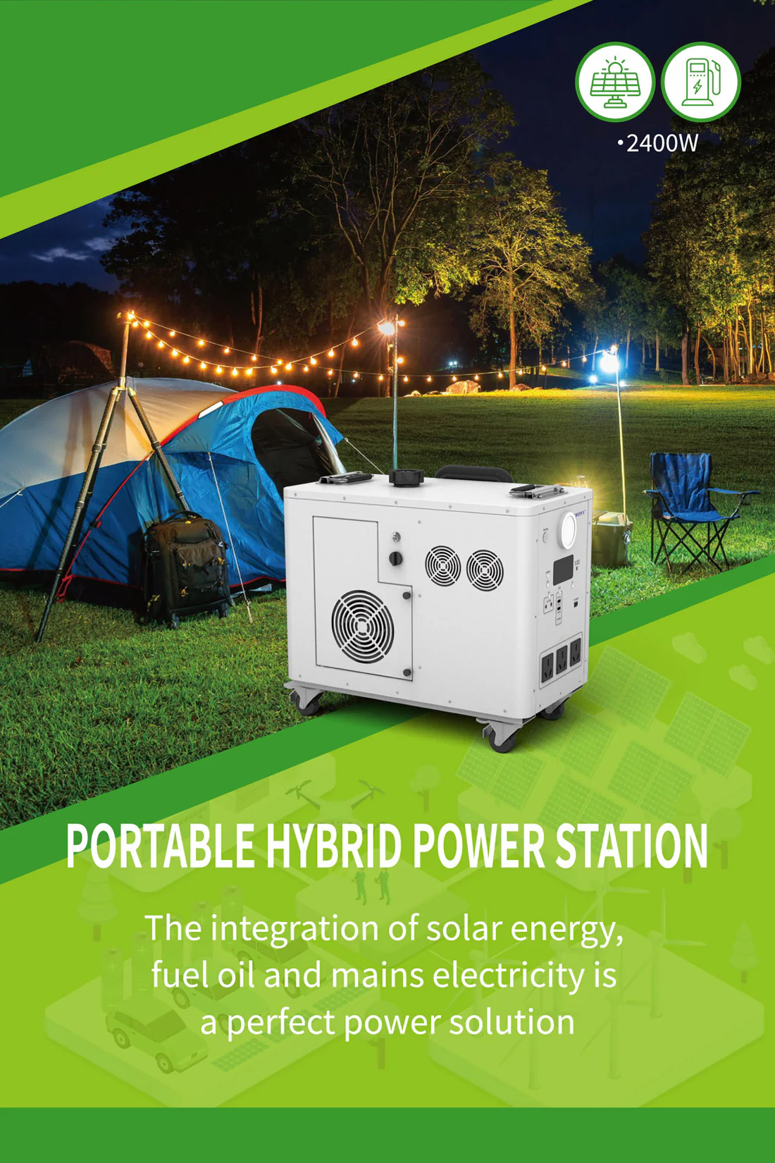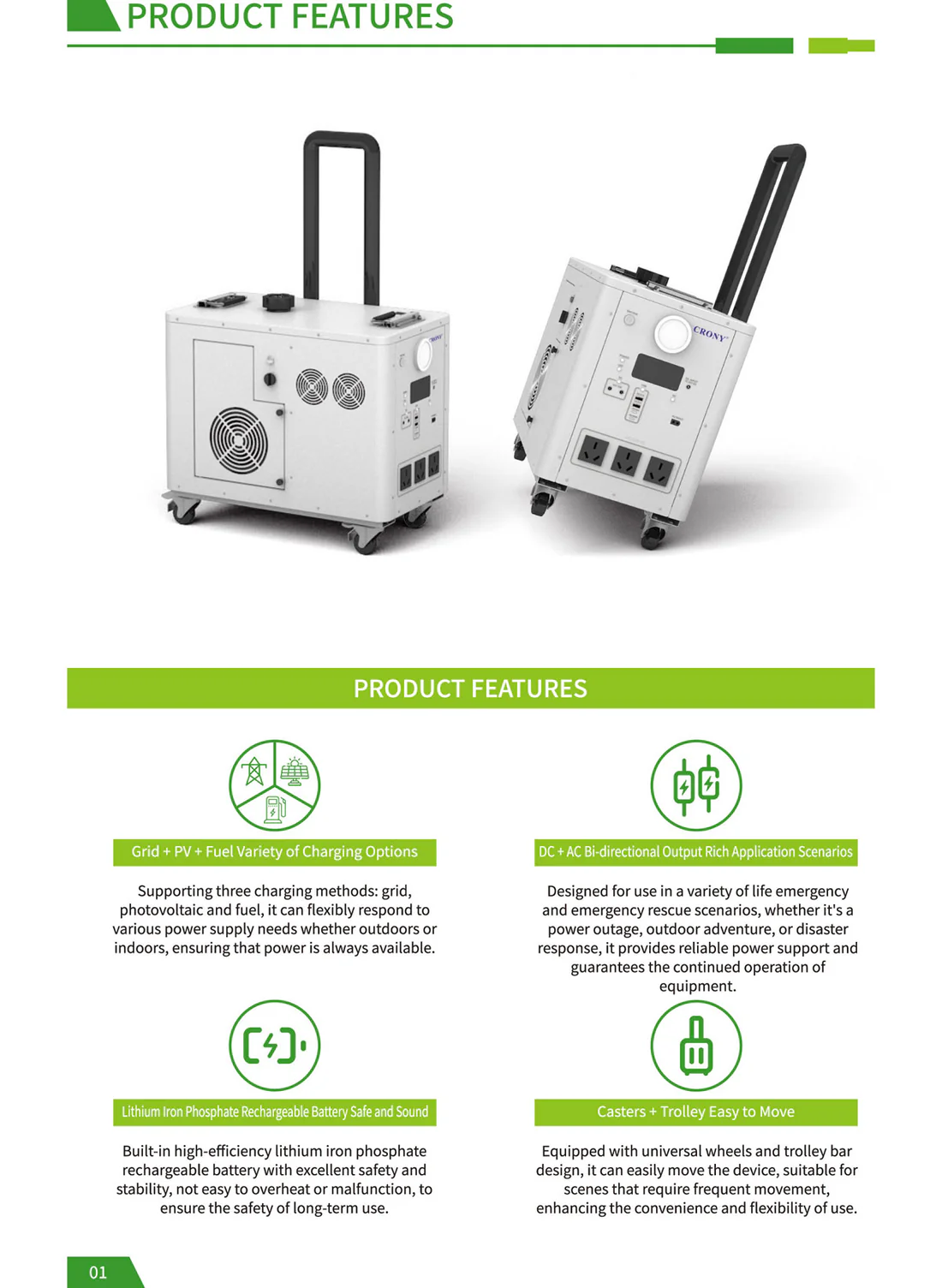 CRONY EB-S1500 2400W Gasoline storage battery With Trolley LiFePO4 Battery 550W Engine with AC DC USB Output for Home and Outdoor Use The biggest selling point of the product: it is the hybrid energy storage mode! Just like a hybrid electric car when the energy storage battery is exhausted add gasoline directly to the gasoline port and the gasoline engine can quickly charge the battery solving the limitations of slow outdoor charging and reliance on solar energy. For example when there is no sun at night and you can't find a charging device adding a barrel of oil can make the battery full of blood which is especially suitable for outdoor operations camping and other scenes that require continuous power supply. Pay special attention before use: When you receive the product you need to add engine oil and then gasoline before you can use the gasoline generator to generate electricity. The product has 70-80% electricity when it leaves the factory and customers can use it directly after receiving the product. Add 150-180ml of engine oil at a time not more than 200ml and add it once every 1-2 months. Just change it once Engine oil plays a lubricating role. Changing the engine oil is mainly to protect the service life of the generator for a longer period of time which is similar to the principle of our car Model : EB-S1500 Battery Capacity : 2400Wh Rated Power : 2400W Battery Type : LiFePo4 Battery Battery Lifecycle : ≥4000 times Solar Input : Solar Panel 400W Max Engine Bore and Stroke : 3933.5mm Engine Displacement : 40cc Maximum Engine Power : 550W Fuel Tank Capacity : 2.2L Start Method : Manual Electric Auto start stop PV Input : XT60 24V DC Input : 24V AC Output : AC Outlet 600W 110V 220V 3 DC Output : 5521 DC 12V 10A Max 2 USB Type-C Output : PD QC3.0 MAX 30W PD100W USB Output : QC3.0 MAX 18W 2 LCD Display : Power percentage and Power bar display Net Weight : 28.5 kg Gross Weight : 30 kg Product Size (mm) : 472 X 4265 X 4336 mm (not including wheels handle bars) Package Dimensions : 555 X 350 X 500 mm