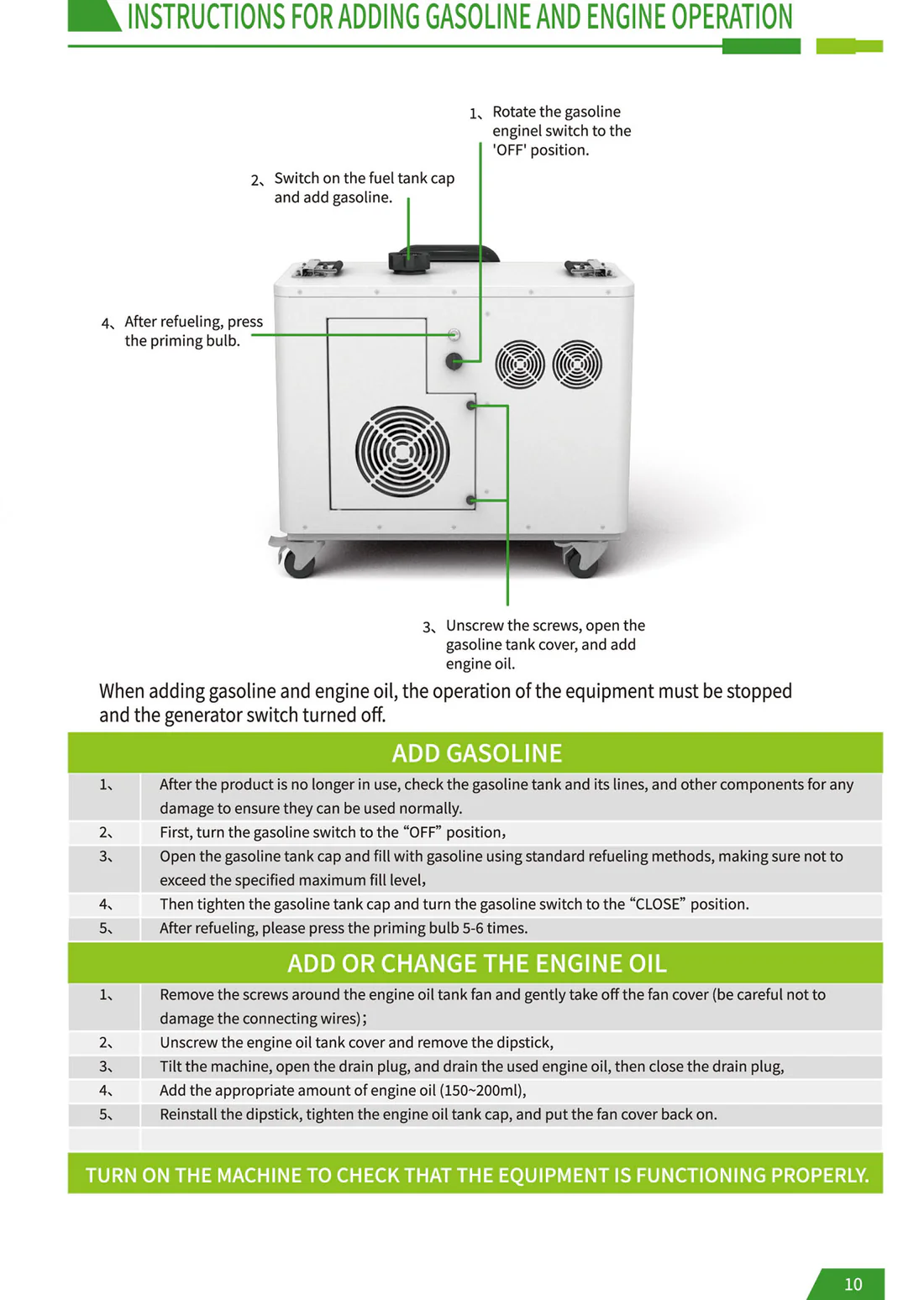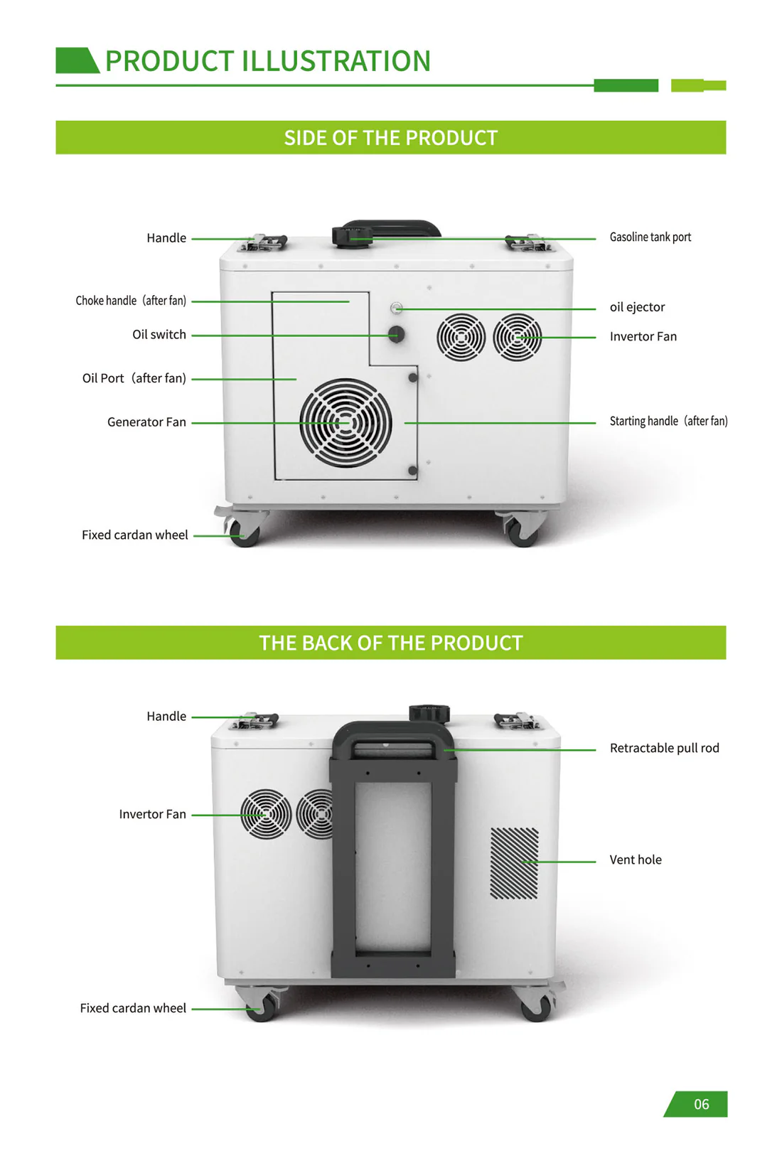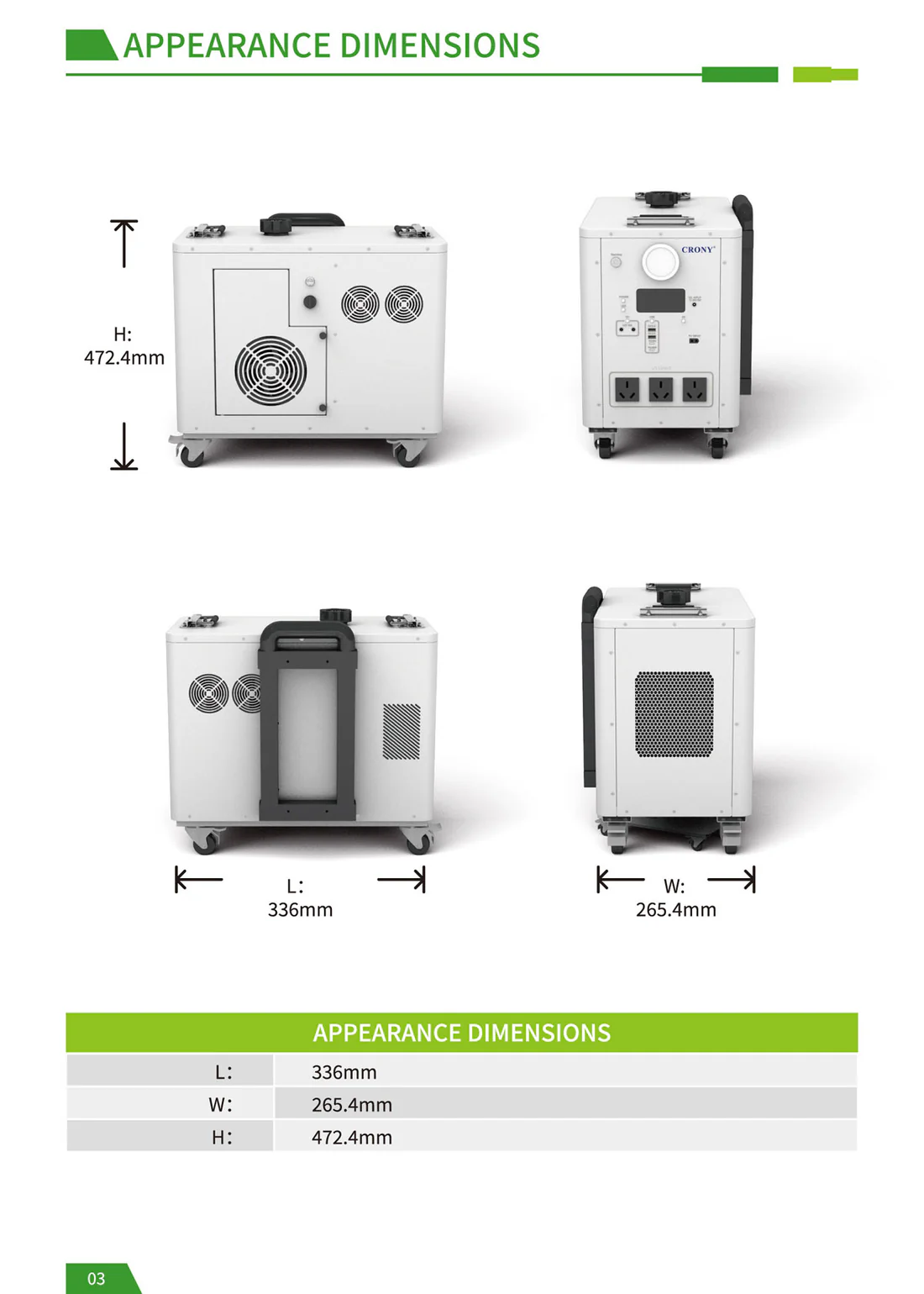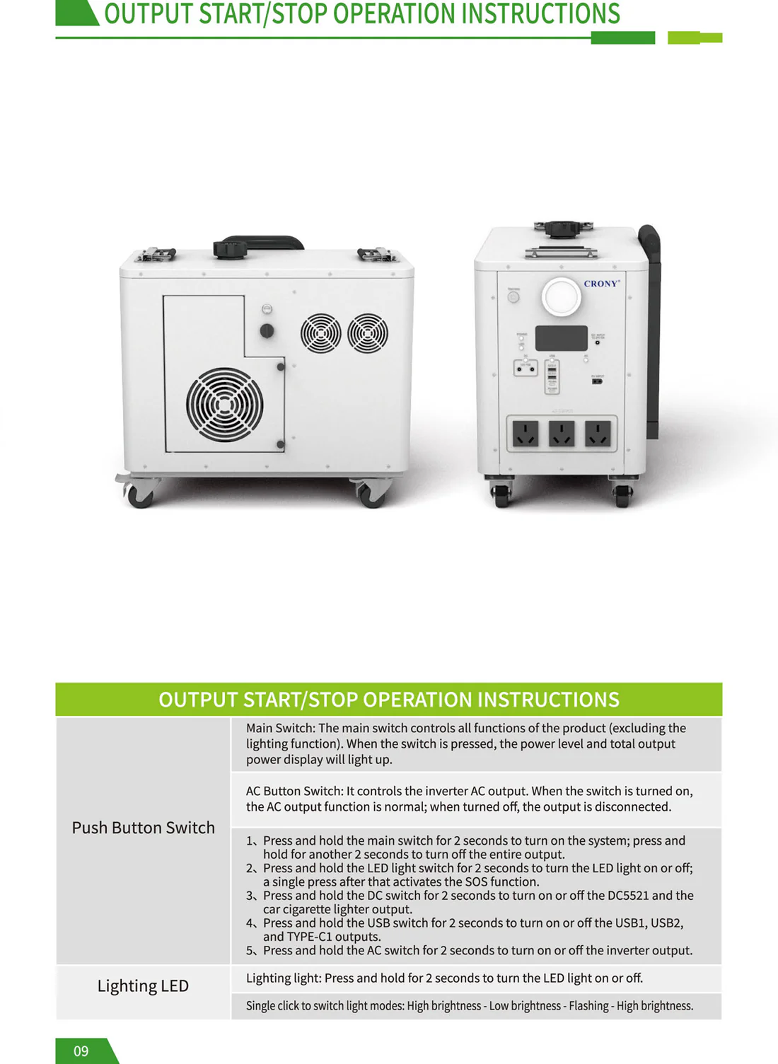 CRONY EB-S1500 2400W Gasoline storage battery With Trolley LiFePO4 Battery 550W Engine with AC DC USB Output for Home and Outdoor Use The biggest selling point of the product: it is the hybrid energy storage mode! Just like a hybrid electric car when the energy storage battery is exhausted add gasoline directly to the gasoline port and the gasoline engine can quickly charge the battery solving the limitations of slow outdoor charging and reliance on solar energy. For example when there is no sun at night and you can't find a charging device adding a barrel of oil can make the battery full of blood which is especially suitable for outdoor operations camping and other scenes that require continuous power supply. Pay special attention before use: When you receive the product you need to add engine oil and then gasoline before you can use the gasoline generator to generate electricity. The product has 70-80% electricity when it leaves the factory and customers can use it directly after receiving the product. Add 150-180ml of engine oil at a time not more than 200ml and add it once every 1-2 months. Just change it once Engine oil plays a lubricating role. Changing the engine oil is mainly to protect the service life of the generator for a longer period of time which is similar to the principle of our car Model : EB-S1500 Battery Capacity : 2400Wh Rated Power : 2400W Battery Type : LiFePo4 Battery Battery Lifecycle : ≥4000 times Solar Input : Solar Panel 400W Max Engine Bore and Stroke : 3933.5mm Engine Displacement : 40cc Maximum Engine Power : 550W Fuel Tank Capacity : 2.2L Start Method : Manual Electric Auto start stop PV Input : XT60 24V DC Input : 24V AC Output : AC Outlet 600W 110V 220V 3 DC Output : 5521 DC 12V 10A Max 2 USB Type-C Output : PD QC3.0 MAX 30W PD100W USB Output : QC3.0 MAX 18W 2 LCD Display : Power percentage and Power bar display Net Weight : 28.5 kg Gross Weight : 30 kg Product Size (mm) : 472 X 4265 X 4336 mm (not including wheels handle bars) Package Dimensions : 555 X 350 X 500 mm