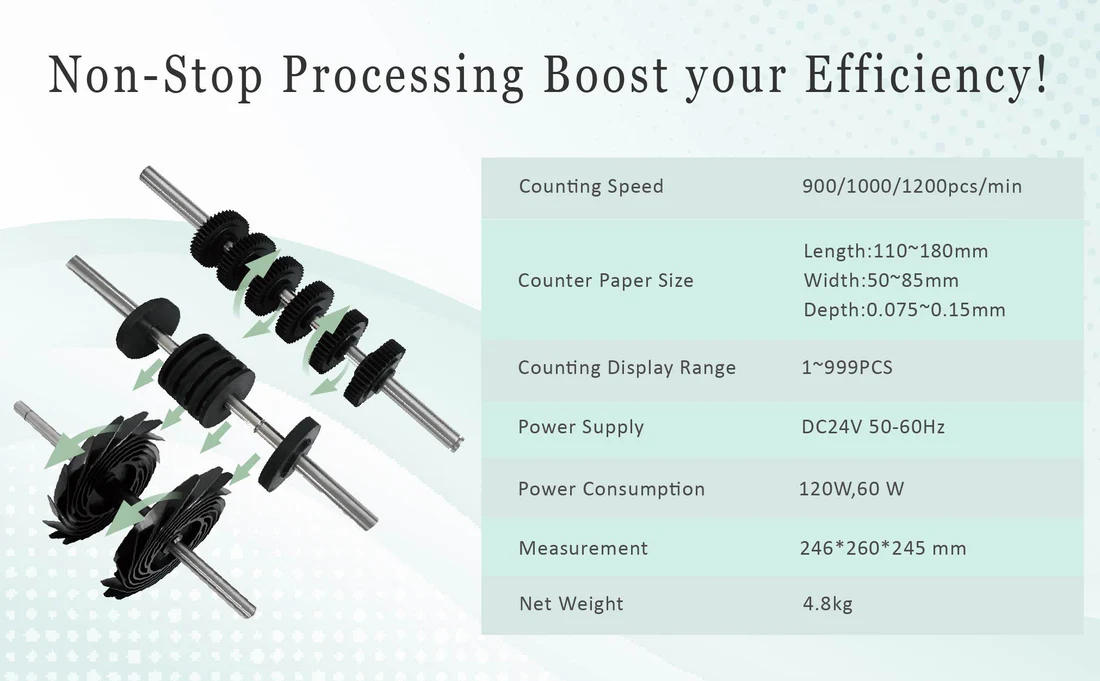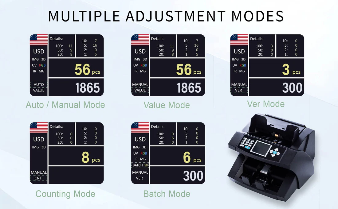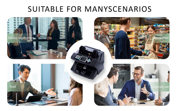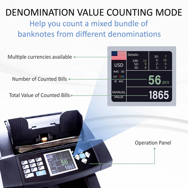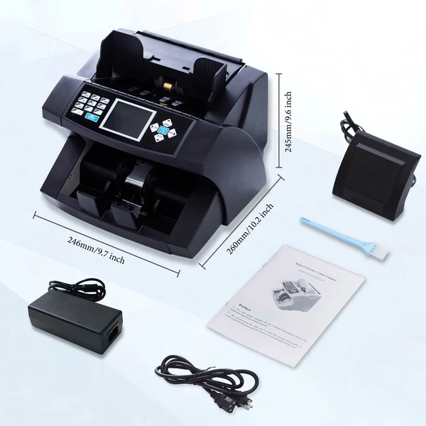 CRONY H-8600 Mixed Denomination Bill Counter High-Speed Banknote Counting Machine with 3 Speed Modes LCD Display for Office Store Bank Use Value Count CRONY H-8600 allows you manually set the amount of money in a pile and alue mix counting; Sorting denomination Easy to Use This bill counter requires no complicated selection directly from the button. It can be used quickly by beginners greatly improving teaching and counting efficiency. Denomination value counting mode Help you count a mixed bundle ofbanknotes from different denominations Multiple currencies available Number of Counted Bills Total Value of Counted Bills Accurate and Fast The bill counter counts up to 1200 banknotes/minute and handles cash quickly with a hopper and stacker that can hold up to 999 banknotes. Enables fast accurate and continuous counting This ensures that you can quickly complete your daily financial counting job Cuts cash counting time by 90% for cafes gas stations and street vendorsBank officeSupermarket Hotel Casino Restaurant Store. MULTIPLE CURRENCIES - Supports most global currencies (AED SAR USD EUR KWD BHD QAR OMR etc.). Software updated via USB disk CRONY provides professional operational guidance for seamless setup. Model :H-8600 Mixed totals counting machine Counting Speed: 900/1000/1200pcs/min Counter Paper Size: Length:110~180mm Width:50~85mm Depth:0.075~0.15mm Counting Display Range:  1~999PCS Power supply: DC24V 50-60Hz Power consumption:120W60 W Measurement: 246260245 mm Net Weight: 4.8kg