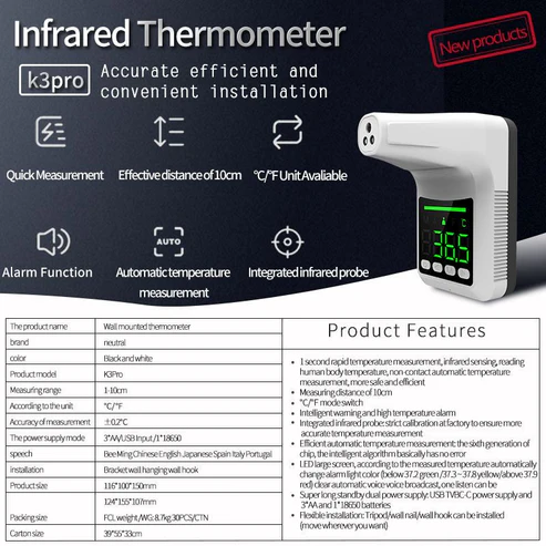Advantage 1. Using a new chip the induction time is faster (500 ms); the pass rate per minute is greatly improved (50 people / min). 2. High temperature measurement accuracy accuracy tolerance: ± 0.2 (34 ~ 45 ℃) 3. With warning of light failure detection and warning of abnormal temperature light. 4. Can be connected to USB power charging treasure self-installed lithium battery. 5. High-definition display 5 meters visible distance. 6. Intelligent infrared forehead thermometer no need to hold can be hung / double-sided adhesive tape / bracket fixed. 7. The price makes up for the vacuum of the price of the handheld forehead gun and the high cost of the thermal imaging temperature measurement door. 8. Can be applied in different occasions. Office / Metro / Home / Supermarket / Shop / Community / Entrance etc.