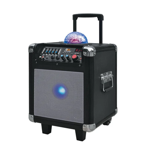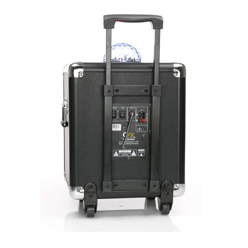 PBX-507100BT Compact Portable Party Speaker with BT Bluetooth Party Mini packs big sound with wireless Bluetooth streaming or USB/SD/FM playback and 300W pumping through the 6.5 woofer and 1 tweeter. Included dynamic microphone and guitar/microphone inputs. Built-in disco dome light rechargeable battery and roller wheels for ease of transport. Bluetooth USB/SD Player with Remote Control FM Radio 5 Band Equalizer RCA In Metal Grill Covered Speakers 2 Guitar/Microphone Input Microphone Included AUX-In Handle and Wheels Disco Ball Lights 6.5" Woofer 1.5" Tweeter 12V 2.3aH Rechargeable Battery AC UL Adapter 120-240V 60Hz-50HZ 35.5X33.5X47.5CM Colors: Silver
