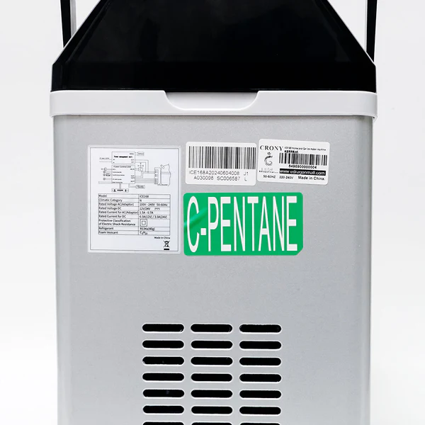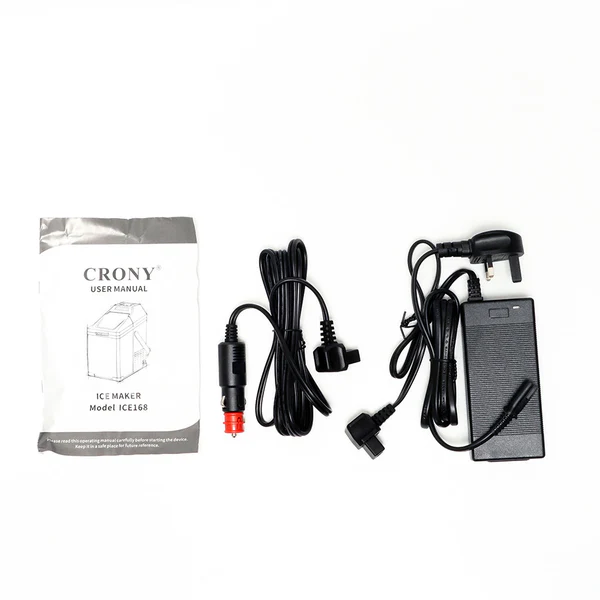 CRONY Portable Ice Maker 1.5L Home Car Use -20C Freezing LED Control 9 Bullet Ice Cubes Fast Ice Making 9 Cubes per CycleHigh-efficiency cooling system produces 9 bullet-shaped ice cubes per cycle perfect for home outdoor and parties. Dual Power Mode for Home CarCompatible with DC 12V/24V for vehicle use and AC 100~240V for home making ice anywhere anytime. LED Control Panel Easy to UseSmart LED panel for effortless operation allowing easy temperature adjustment and ice-making status check. Portable Design for Easy TransportEquipped with a convenient handle and protective foot pad for easy carrying and stable placement ideal for camping travel and home gatherings. Model :   ICE168 Rated Voltage :   DC 12V/24V; AC 100~240V Power Consumption : 72W Power Source :  AC/DC Capacity :    1.5L Noise Level :    ≤45dB Temperature Range : -20C to 20C Product Size :  26.8x35.5x41.3CM Net Weight :   10.2KG Gross Weight :  11.1KG Additional Features : LED Control Panel 9 Ice cubes per cycle Convenient handle Protective foot pad Bullet shape Ice Car Battery Protection