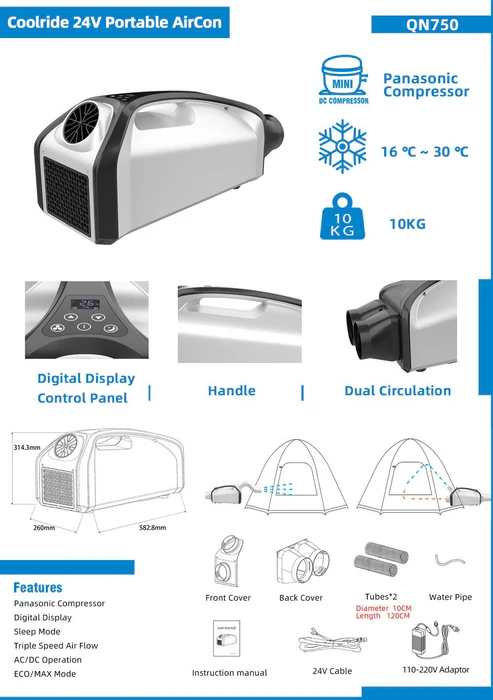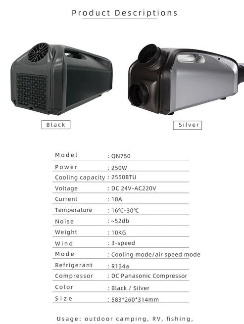 Quick Details Product Name: Manufacturer 2500BTU Portable Air Conditioner 24V Air Conditioner Wholesale Model NO.: QN750 Component: Compressor Power Supply Type: DC Power Source: Compressor Shape: Rectangle Refrigeration Temperature 16~30 Celsius Scope: Voltage: 24V Capacity: 2500 BTU Type: Compressor Car Refrigerator Function: Rapid Cooling Feature: Portable Air Conditioner Cooling System: DC Compressor Usage: Camping/Tent Air Conditioner Refrigerant: R134A/12345yf Applicaton: Camping Outdoor Input Voltage: 24V Specification: 583260315mm HS Code: 8415101000