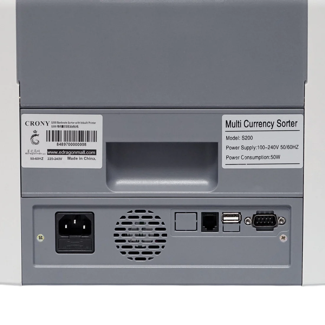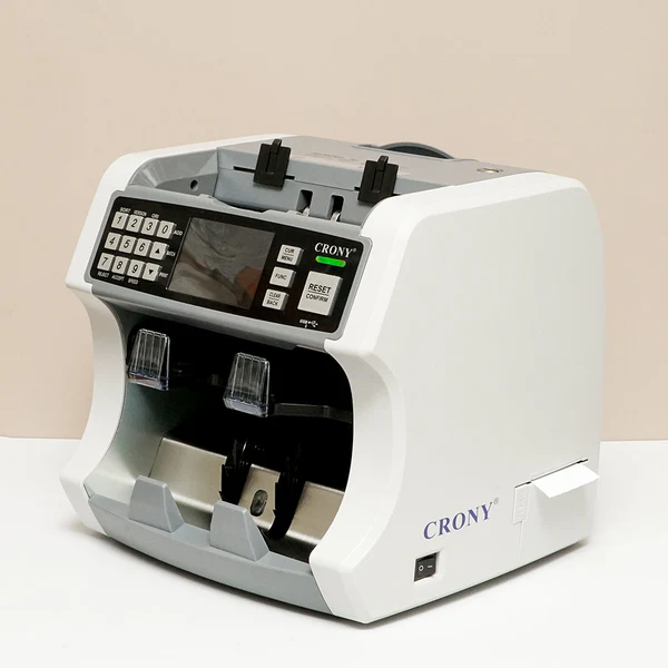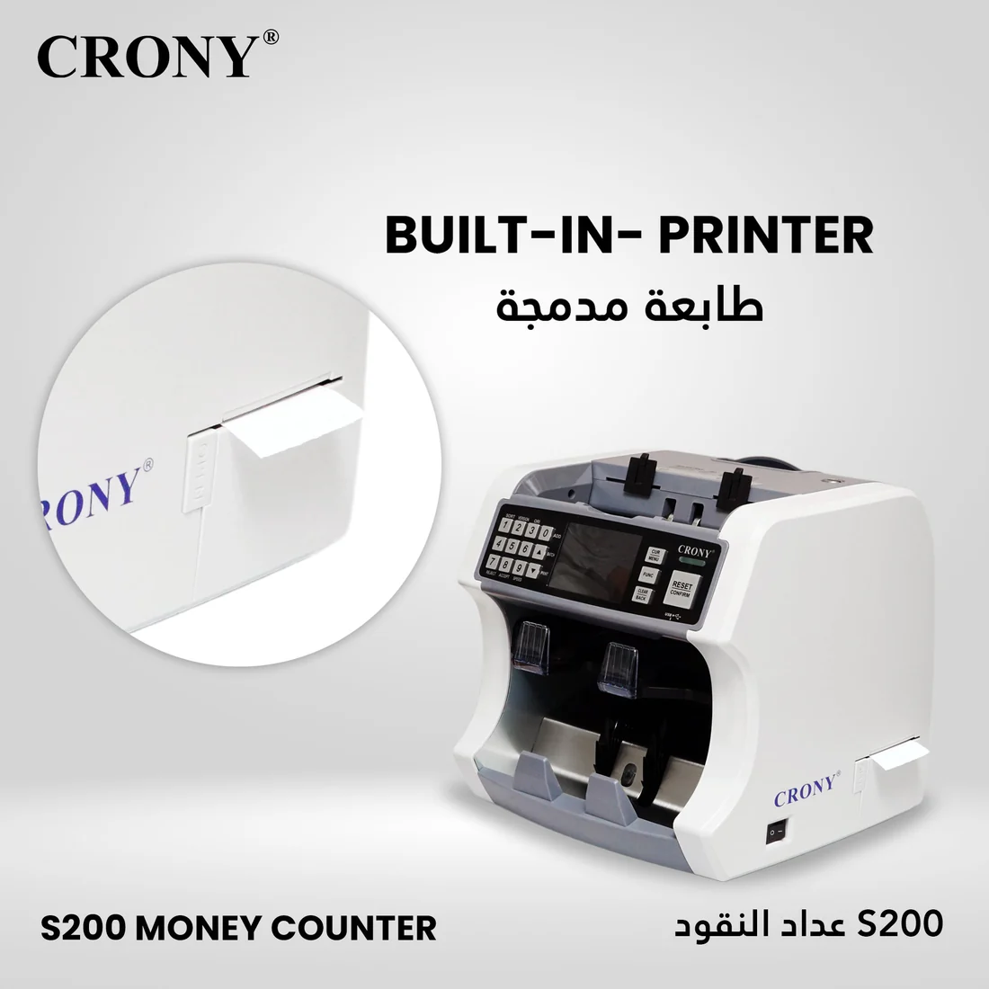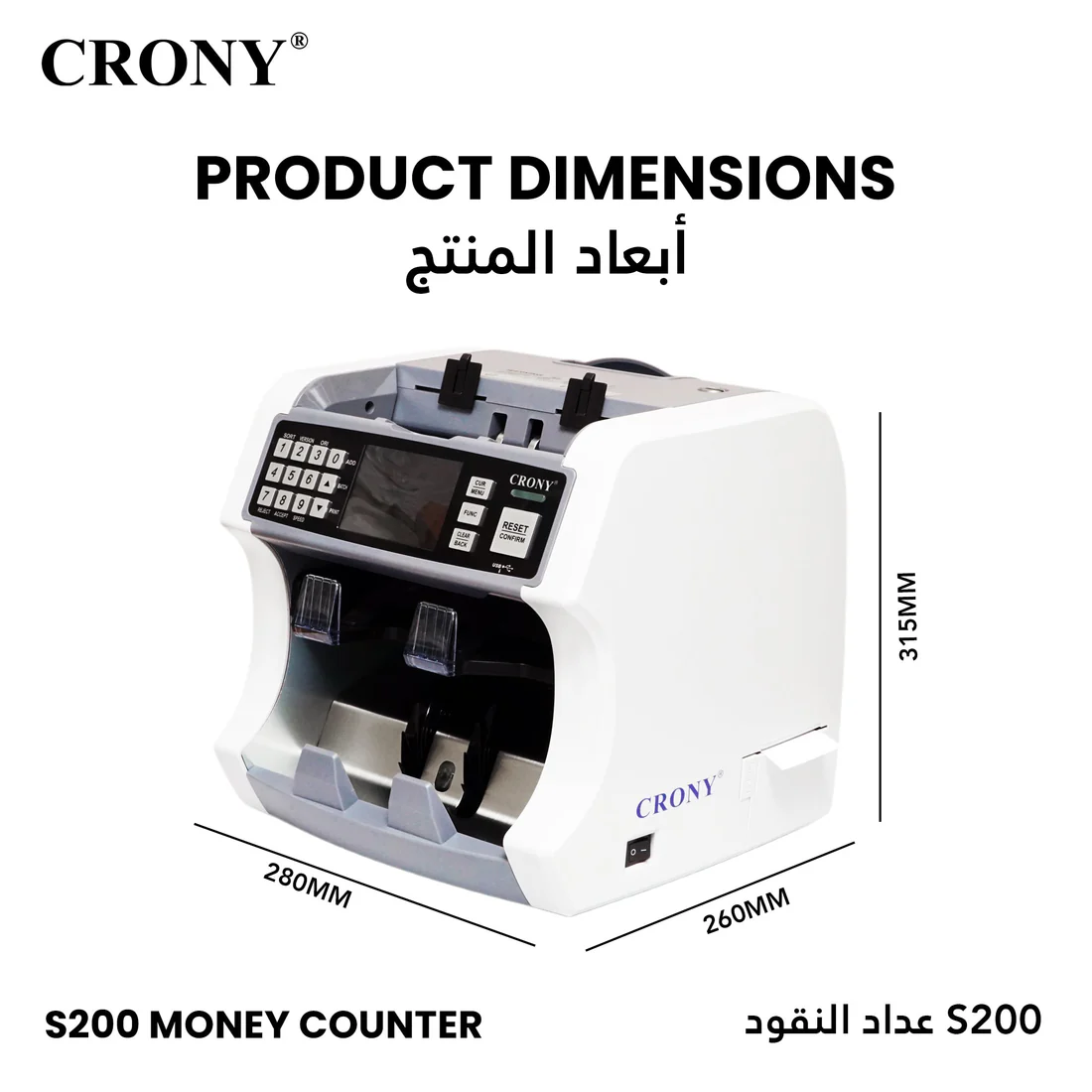 CRONY S200 High-Speed Smart Bill Counter 1000 Notes/Min Built-in Thermal Printer Touch Screen Banknote Verifiers High-Speed Counting with Large CapacityCounts up to 1000 notes per minute with a 500-note hopper ideal for banks and retail businesses Advanced Counterfeit DetectionUses UV light magnetic detection IR light and 2-CIS technology for superior counterfeit detection and security Built-in Thermal Printer with Touch ScreenIntegrated thermal printer for direct receipt printing and intuitive touch screen for seamless operation Smart Interface with Multi-Device CompatibilityEquipped with USB RS-232 and RJ-11 ports for external display and data transfer enhancing versatility Model :   S200 Counting Speed :   800/900/1000 pcs/min Hopper Capacity :   500pcs Stacker Capacity :  200pcs Reject Capacity :  80pcs Detection Technology : UV Light Magnetic Detection IR Light Detection 2-CIS Power Supply :  AC 100-240V Power Consumption : ≤50W Interface :   USB RS-232 RJ-11 Product Size :  280x260x315MM Weight :   12KG 3 Months Free Software Update Additional Features : Built-in TFT Display Built-in Thermal printer Touch Screen External Display