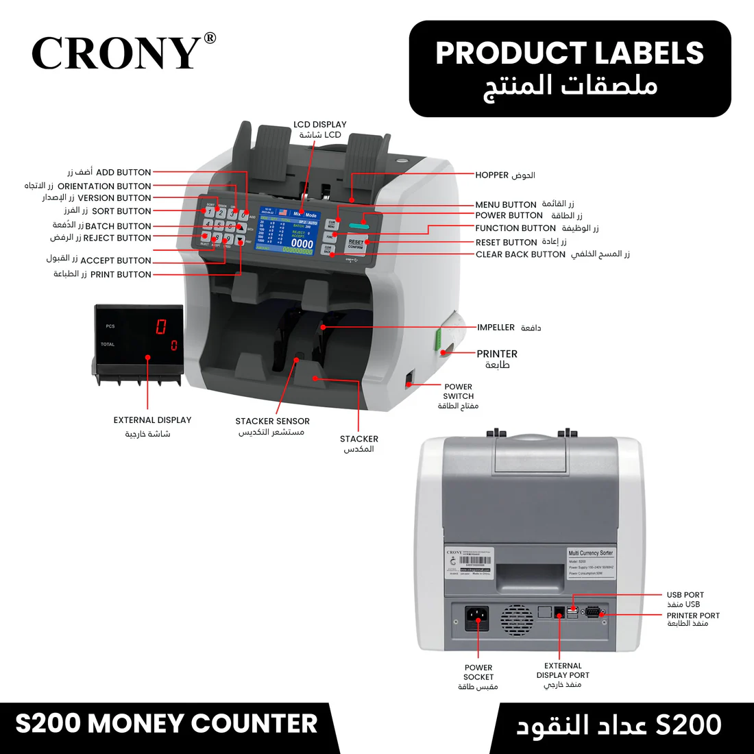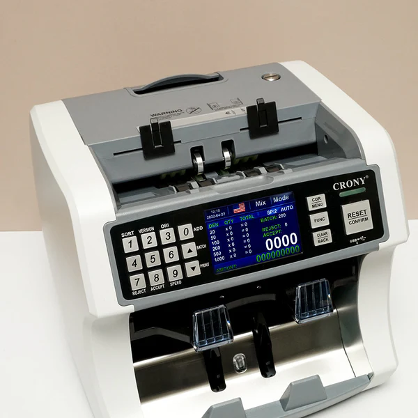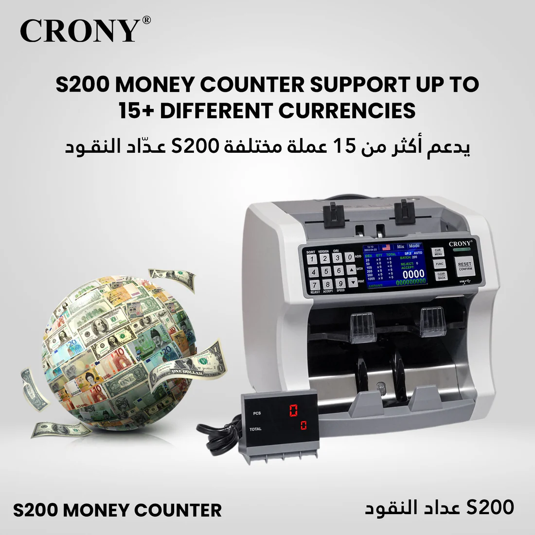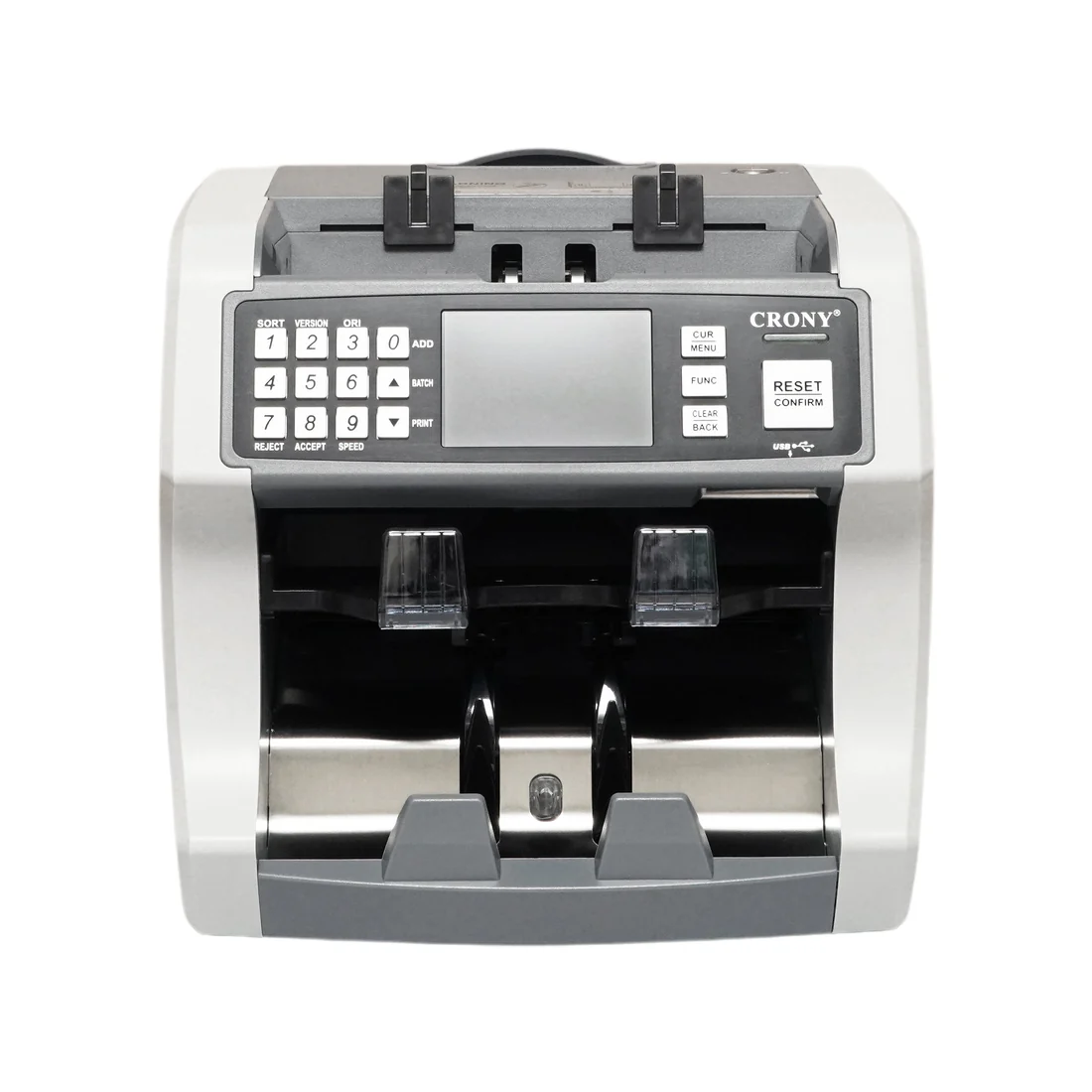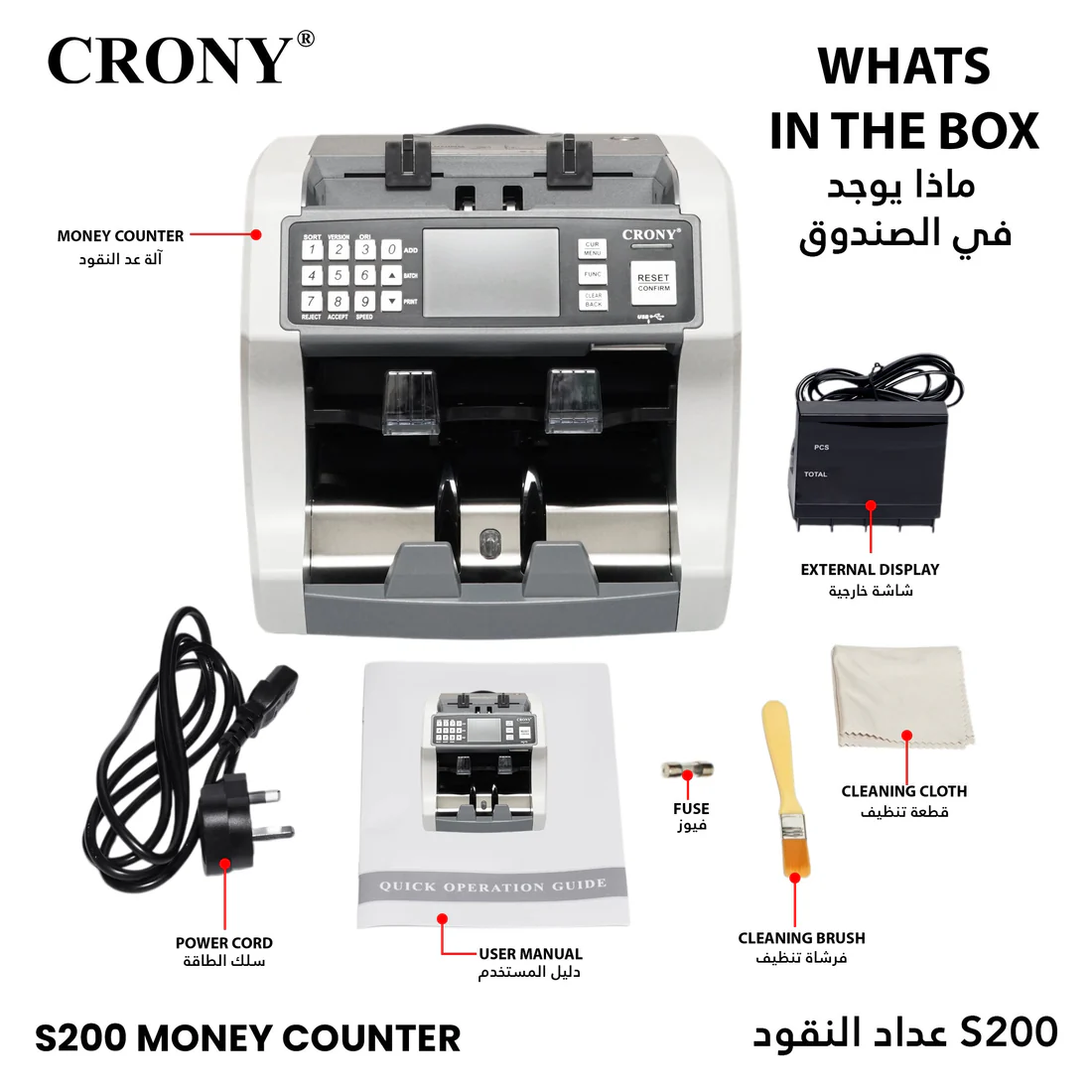 CRONY S200 High-Speed Smart Bill Counter 1000 Notes/Min Built-in Thermal Printer Touch Screen Banknote Verifiers High-Speed Counting with Large CapacityCounts up to 1000 notes per minute with a 500-note hopper ideal for banks and retail businesses Advanced Counterfeit DetectionUses UV light magnetic detection IR light and 2-CIS technology for superior counterfeit detection and security Built-in Thermal Printer with Touch ScreenIntegrated thermal printer for direct receipt printing and intuitive touch screen for seamless operation Smart Interface with Multi-Device CompatibilityEquipped with USB RS-232 and RJ-11 ports for external display and data transfer enhancing versatility Model :   S200 Counting Speed :   800/900/1000 pcs/min Hopper Capacity :   500pcs Stacker Capacity :  200pcs Reject Capacity :  80pcs Detection Technology : UV Light Magnetic Detection IR Light Detection 2-CIS Power Supply :  AC 100-240V Power Consumption : ≤50W Interface :   USB RS-232 RJ-11 Product Size :  280x260x315MM Weight :   12KG 3 Months Free Software Update Additional Features : Built-in TFT Display Built-in Thermal printer Touch Screen External Display