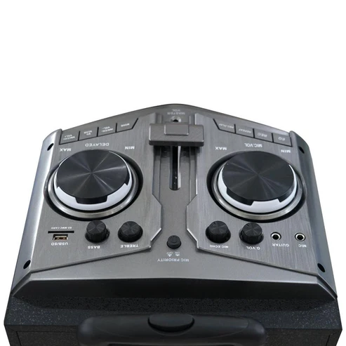 PRODUCT FEATURES : Includes one wireless mic audio cable car charger cable charging cable Has got a unique appearance design noble generous Built in power amplifier system can be directly used with CD/DVD/PC audio source Manual all wooden box production high grade appearance of the panel Can be used alone AC 220V power supply and DC 12V power supply The built in maintenance free rechargeable batteries also can use an external battery Dual microphone input simulating reverberation effect Wireless acoustic microphone built in antenna Built in USB/SD card decoder Guitar input control alone Output Power : 100 W Input Level : 500 mV Signal to Noise Ratio : 80 dB or higher Degrees of Separation : 35 dB Frequency Response : 60 Hz to 20 KHz Power Input Voltage : 220 v/50 Hz R.M.S : 500 W Color : Black