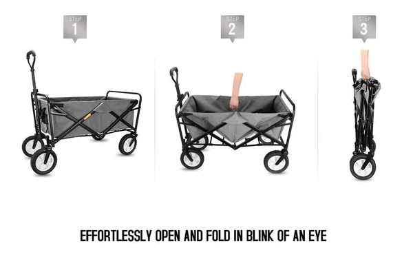 Product Description Green Large Capacity Wagon opens to approx 35" 20"46" and SETS UP IN SECONDS - No Assembly Required! CONVENIENT COMPACT STORAGE - Wagon folds to only 4" Thick! Folded size approx30" x 21" x 4" and includes a carry case LIGHTEN THE LOAD! The heavy duty frame allows loads up to 176 lbs and the Durable 600D Fabric can be easily cleaned. FUNCTIONAL FEATURES include an Adjustable Handle for effortless transport and 2 Mesh Cup Holders keep your beverages secure EASY TRANSPORT - Perfect for hauling gear to Outdoor Sporting Events Concerts Trips to the Park or Beach and great for use around the house Model TC3015 Product size 9050117cm (LWH) Folding size 785310cm (LWH) Carton MEAs 695413 cm loading capacity 80kgs G.W/N.W 9/10 kgs