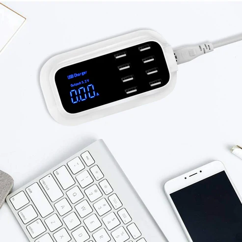 CRONY CD-A19 8-Port USB Adapter Desktop Wall Charger Smart LED Display Item type:8 Port USB Charger 100-240V worldwide universal voltage Smart IC chip output more protection Real-time current Real-time voltage battery level to show charging process Portable size easy to carry Input: AC 100V-240V 50/60Hz. Applied to the digital products with input voltage is 5.0V 5%. Power: 40W Output Voltage: 5.0V. Output Current:8.0A.MAX. USB Output: 2.1A Max. LED Indicator Light: yes Dimension: Approx. L136 x W73 x H50mm. Cable Length:1.5m Package Include: 1x 8 Port USB Charger 1x AC Cable