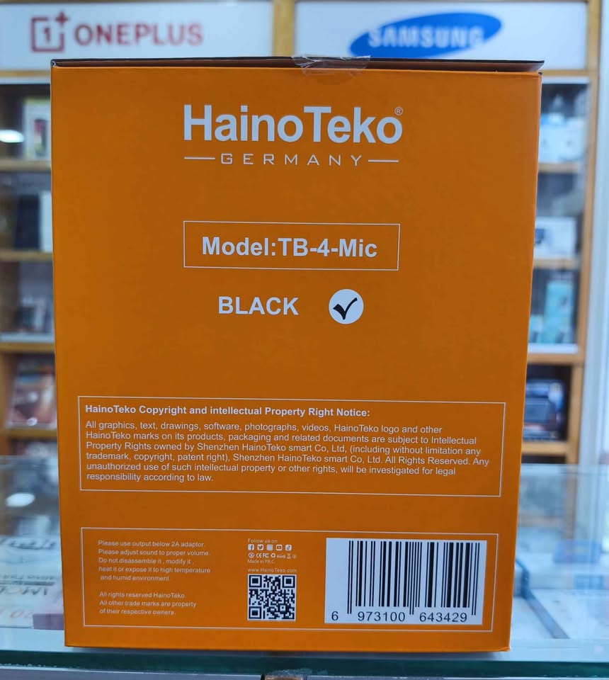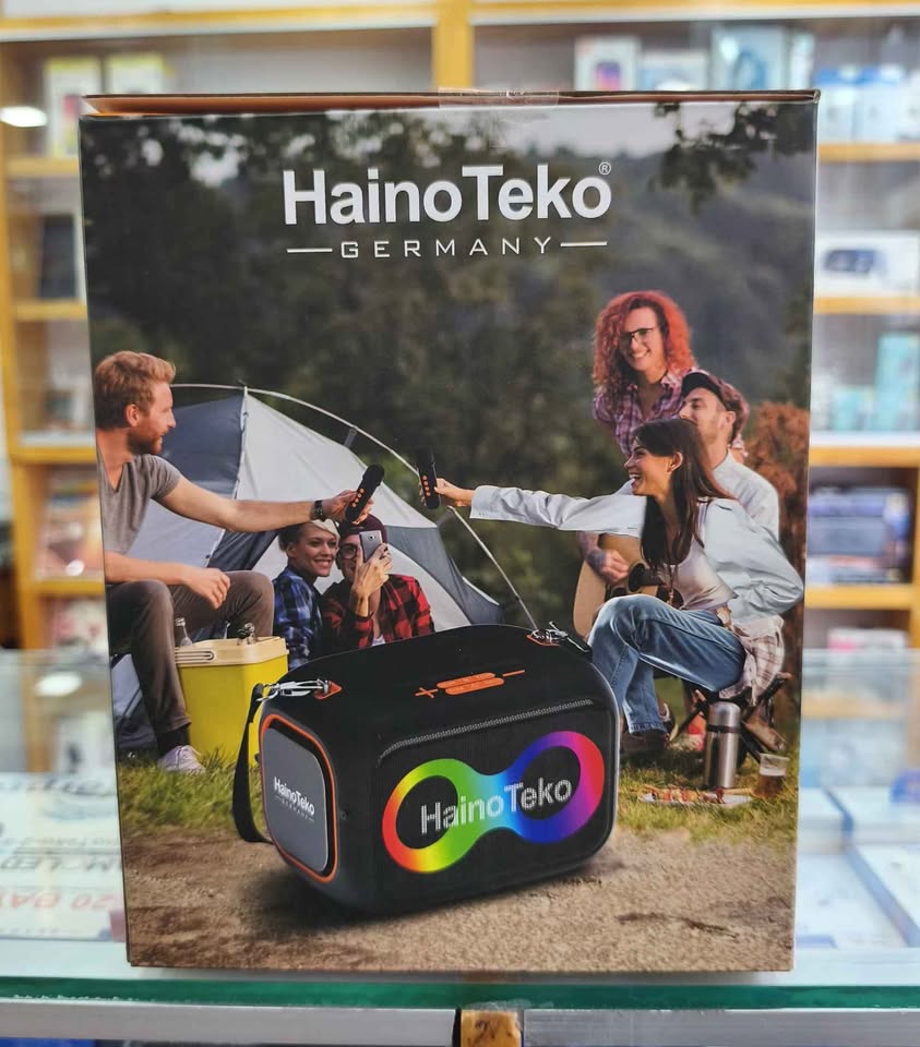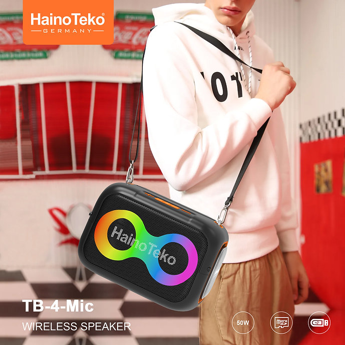Turn up the volume and the fun with the Haino Teko TB-4 Bluetooth Speaker built for power performance and party-ready versatility. Boasting 50W output power it floods any space with booming bass and clean highs. With two wireless microphones included you can host karaoke nights speeches or group calls right out of the box. Dynamic RGB lighting that pulses with your music adds visual flair to every beat while multi-functional buttons give you control over playback volume mode and lighting without needing to reach for your device. Designed for mobility and long sessions the TB-4 packs a durable build and a battery that delivers extended playtime (hours of continuous use). Its sleek black finish sturdy construction and portable design make it a reliable companion for outdoor gatherings indoor parties or any time you want robust sound with mic functionality. Whether you're jamming solo or sharing the spotlight this speaker combo offers the convenience style and features to amplify your experience. 3. Key Specifications 50W output power for robust high-volume audio coverage Includes 2 wireless microphones for karaoke or presentation use RGB lighting effects that sync or pulse with music to enhance the atmosphere Multi-functional button controls: volume track changes mode lighting toggles Bluetooth wireless connection for seamless pairing with devices Portable design with durable black finish and long battery-powered playback Includes charging cable user manual and full speaker + mic set in package