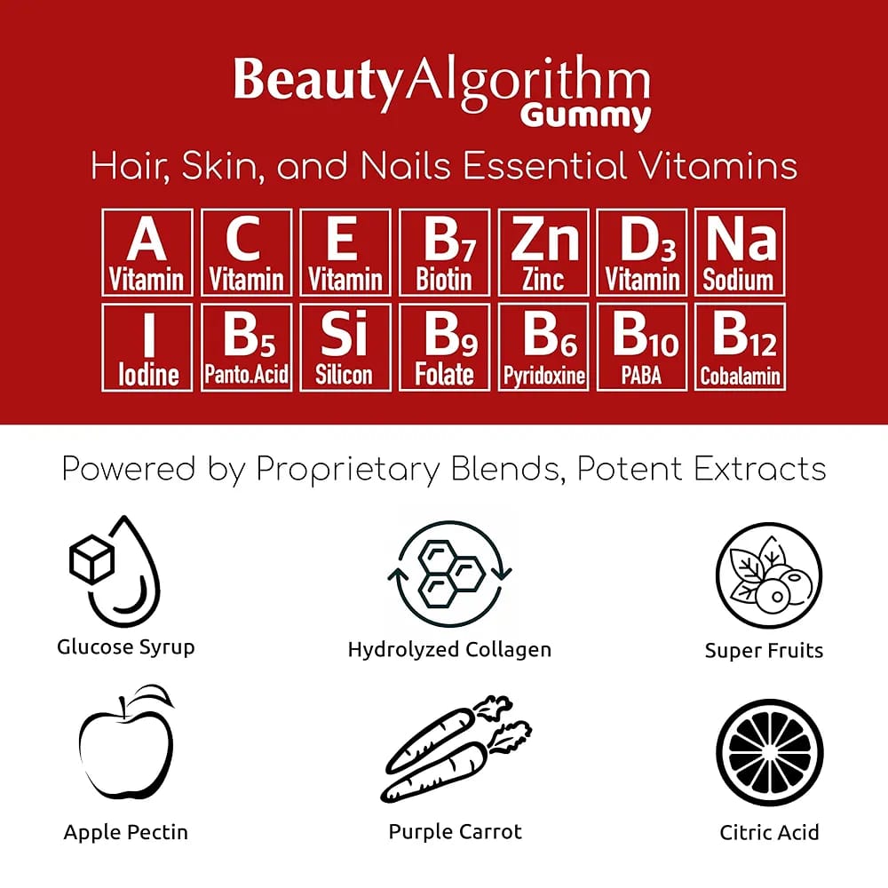 Boost your natural beauty with HairDaily Gummy Advanced Formula by Afterave Essentials. Packed with Biotin (6000mcg) Vitamins A C D E B-Complex Zinc and essential nutrients these tasty gummies support faster hair growth stronger nails glowing skin and enhanced collagen production. A complete antioxidant-rich daily supplement designed to improve overall beauty and wellness. Key Features: Advanced Hair Growth Support 6000mcg Biotin + Multivitamins Stronger Nails Healthy Skin With Zinc Collagen Boost Antioxidant Power Vitamins A C D E protect against free radicals B-Complex Blend Supports energy metabolism overall wellness Delicious Gummy Form Easy to take no pills required Daily Beauty Formula Complete inside-out support for hair skin nails Specifications: Brand: Afterave Essentials Product Name: HairDaily Gummy Advanced Formula Form: Gummies Key Ingredients: Biotin (6000 mcg) Vitamins A C D E B-Complex Zinc Sodium Antioxidants Collagen Support Benefits: Hair Growth Nail Strength Skin Glow Collagen Production Diet Type: Gluten-Free Non-GMO (if applicable) Recommended Use: Daily supplement for adults
