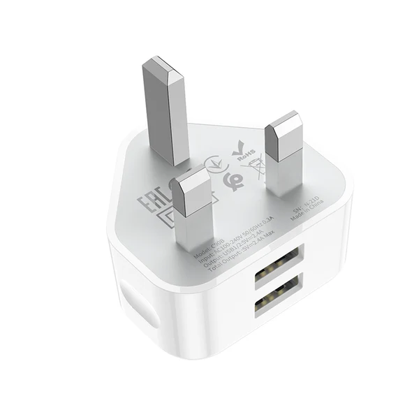 Material: Made from durable ABS and flame-retardant PC for safety and longevity. USB Output: Dual USB-A ports delivering 5V / 2.1A with a total combined output of 5V / 2.1A. Plug Type: Designed with a British (UK) standard plug for wide compatibility. Dimensions Weight: Compact size of 48 × 43.5 × 45.5 mm and lightweight at 35 g perfect for travel and home use.