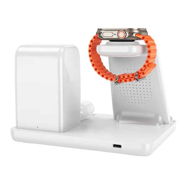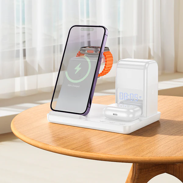 Input (Type-C): 5V/3A 9V/2A 12V/2A Wireless Output: Smartphone: 5W / 7.5W / 10W / 15W Earphones: 5W Smartwatch: 2.5W (compatible with Apple Watch Series 19 SE/SE2 Ultra/Ultra2 and Samsung Watch Series 15) Power Requirement: Requires a PD or QC charger (not included) Material: High-quality ABS + PC Dimensions Weight: 164 × 126 × 112 mm; 311 g Additional Features: Built-in clock with alarm function and integrated night light